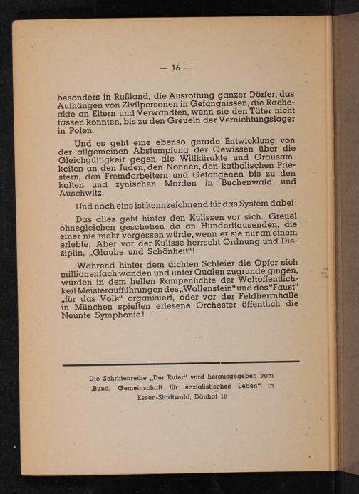 Während hinter dem dichten Schleier die Opfer sich millionenfach wanden und unter Qualen zugrunde gingen, wurden in dem hellen Rampenlichte der Weltöffentlich­keit Meisteraufführungen des ,, Wallenstein" und des" Faust" ,, für das Volk" organisiert, oder vor der Feldherrnhalle in München spielten erlesene Orchester öffentlich die Neunte Symphonie!