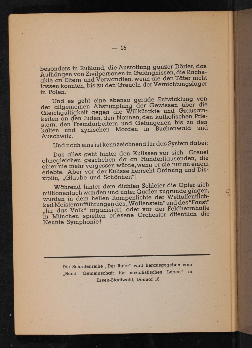 Während hinter dem dichten Schleier die Opfer sich millionenfach wanden und unter Qualen zugrunde gingen, wurden in dem hellen Rampenlichte der Weltöffentlichkeit Meisteraufführungen des ,, Wallenstein" und des" Faust" ,, für das Volk" organisiert, oder vor der Feldherrnhalle in München spielten erlesene Orchester öffentlich die Neunte Symphonie!