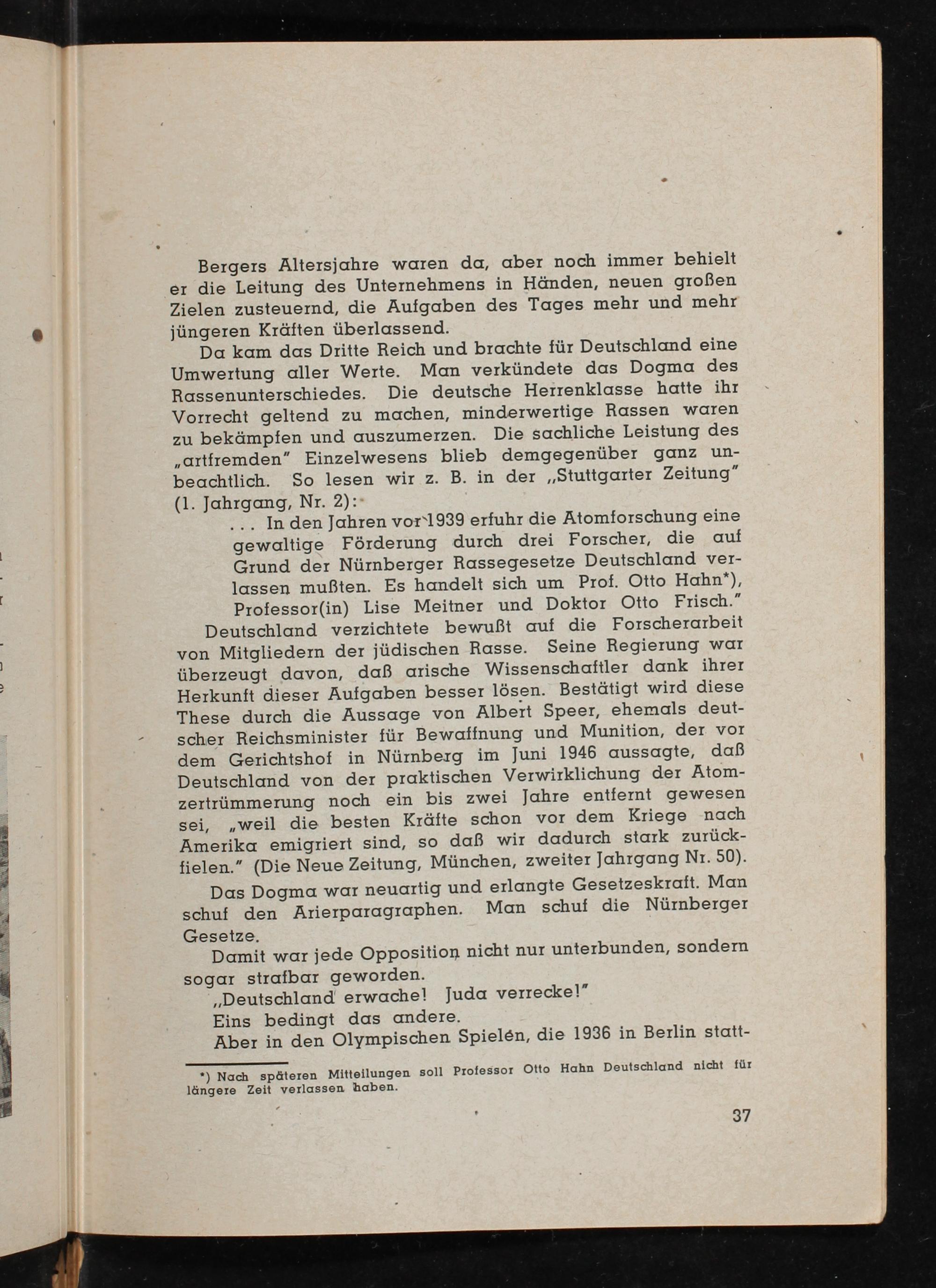 .. In den Jahren vor 1939 erfuhr die Atomforschung eine gewaltige Förderung durch drei Forscher, die auf Grund der Nürnberger Rassegesetze Deutschland verlassen mußten. Es handelt sich um Prof. Otto Hahn *), Professor( in) Lise Meitner und Doktor Otto Frisch ." Deutschland verzichtete bewußt auf die Forscherarbeit von Mitgliedern der jüdischen Rasse. Seine Regierung war überzeugt davon, daß arische Wissenschaftler dank ihrer Herkunft dieser Aufgaben besser lösen. Bestätigt wird diese These durch die Aussage von Albert Speer, ehemals deutscher Reichsminister für Bewaffnung und Munition, der vor dem Gerichtshof in Nürnberg im Juni 1946 aussagte, daß Deutschland von der praktischen Verwirklichung der Atomzertrümmerung noch ein bis zwei Jahre entfernt gewesen. sei, weil die besten Kräfte schon vor dem Kriege nach Amerika emigriert sind, so daß wir dadurch stark zurückfielen."( Die Neue Zeitung, München, zweiter Jahrgang Nr. 50).