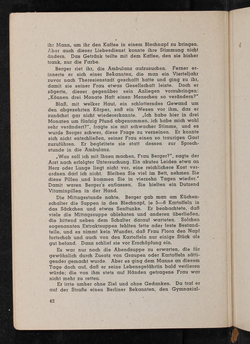Was soll ich mit Ihnen machen, Frau Berger?", sagte der Arzt nach erfolgter Untersuchung. Ein akutes Leiden etwa an Herz oder Lunge liegt nicht vor, eine reichlichere Kost verordnen darf ich nicht. Bleiben Sie viel im Bett, nehmen Sie diese Pillen und kommen Sie in vierzehn Tagen wieder." Damit waren Berger's entlassen. Sie hielten ein Dutzend Vitaminpillen in der Hand.