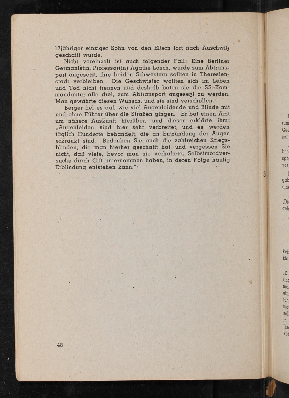 Nicht vereinzelt ist auch folgender Fall: Eine Berliner Germanistin, Professor(in) Agathe Lasch , wurde zum Abtrans- port angesetzt, ihre beiden Schwestern sollten in Theresien- stadt verbleiben. Die Geschwister wollten sich im Leben und Tod nicht trennen und deshalb baten sie die SS.-Kom- mandantur alle drei, zum Abtransport angeseßt zu werden. Man gewährte diesen Wunsch, und sie sind verschollen.