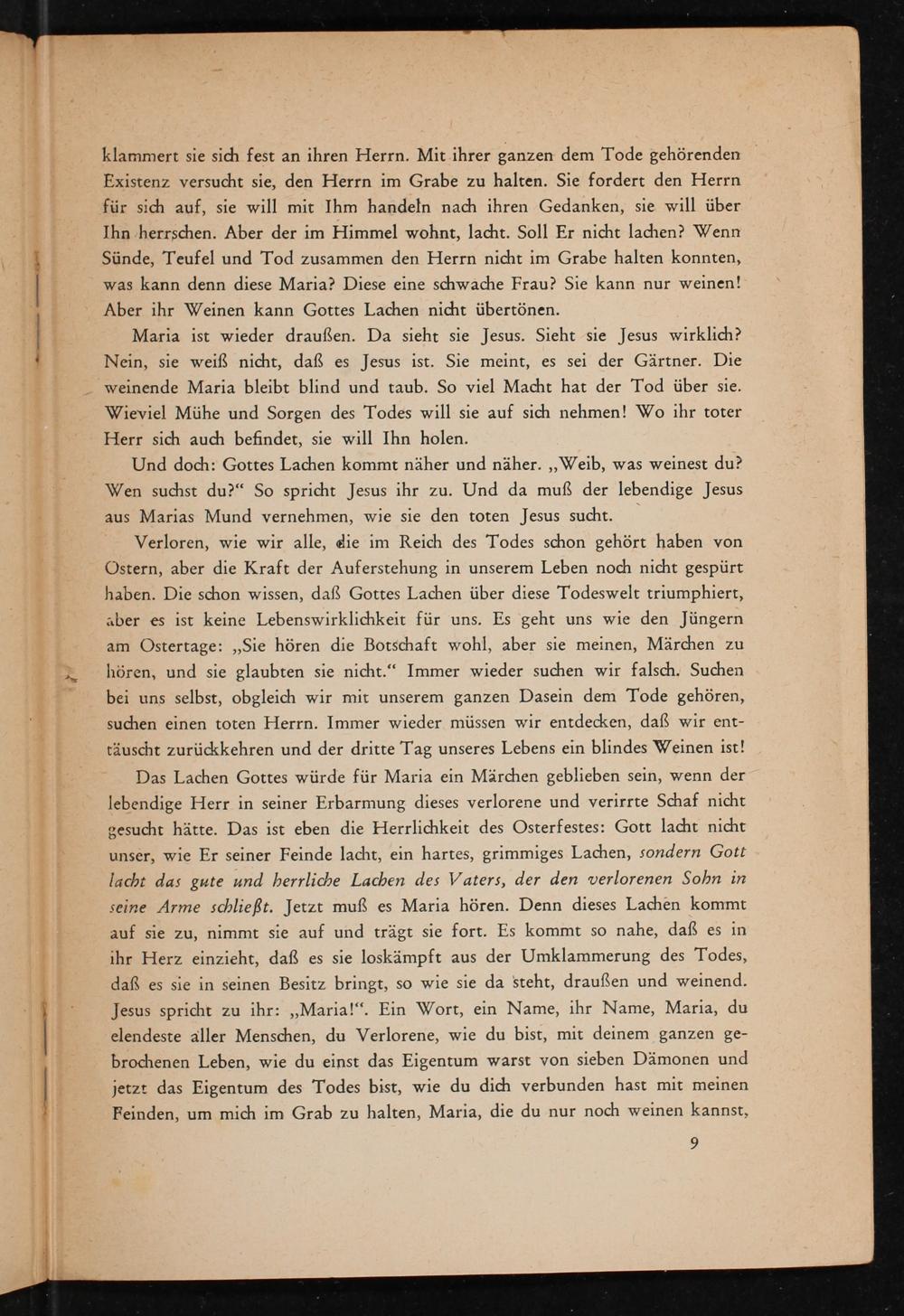 Das Lachen Gottes würde für Maria ein Märchen geblieben sein, wenn der lebendige Herr in seiner Erbarmung dieses verlorene und verirrte Schaf nicht gesucht hätte. Das ist eben die Herrlichkeit des Osterfestes: Gott lacht nicht unser, wie Er seiner Feinde lacht, ein hartes, grimmiges Lachen, sondern Gott lacht das gute und herrliche Lachen des Vaters, der den verlorenen Sohn in seine Arme schließt. Jetzt muß es Maria hören. Denn dieses Lachen kommt auf sie zu, nimmt sie auf und trägt sie fort. Es kommt so nahe, daß es in ihr Herz einzieht, daß es sie loskämpft aus der Umklammerung des Todes, daß es sie in seinen Besitz bringt, so wie sie da steht, draußen und weinend. Jesus spricht zu ihr: ,, Maria!". Ein Wort, ein Name, ihr Name, Maria, du elendeste aller Menschen, du Verlorene, wie du bist, mit deinem ganzen gebrochenen Leben, wie du einst das Eigentum warst von sieben Dämonen und jetzt das Eigentum des Todes bist, wie du dich verbunden hast mit meinen Feinden, um mich im Grab zu halten, Maria, die du nur noch weinen kannst,