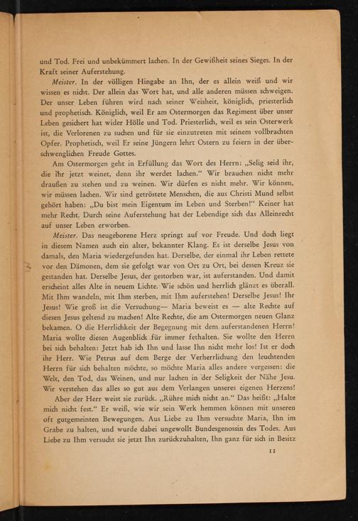Meister. Das neugeborene Herz springt auf vor Freude. Und doch liegt in diesem Namen auch ein alter, bekannter Klang. Es ist derselbe Jesus von damals, den Maria wiedergefunden hat. Derselbe, der einmal ihr Leben rettete vor den Dämonen, dem sie gefolgt war von Ort zu Ort, bei dessen Kreuz sie gestanden hat. Derselbe Jesus, der gestorben war, ist auferstanden. Und damit erscheint alles Alte in neuem Lichte. Wie schön und herrlich glänzt es überall. Mit Ihm wandeln, mit Ihm sterben, mit Ihm auferstehen! Derselbe Jesus ! Ihr Jesus ! Wie groß ist die Versuchung Maria beweist es- alte Rechte auf diesen Jesus geltend zu machen! Alte Rechte, die am Ostermorgen neuen Glanz bekamen. O die Herrlichkeit der Begegnung mit dem auferstandenen Herrn! Maria wollte diesen Augenblick für immer fethalten. Sie wollte den Herrn bei sich behalten: Jetzt hab ich Ihn und lasse Ihn nicht mehr los! Ist er doch ihr Herr. Wie Petrus auf dem Berge der Verherrlichung den leuchtenden Herrn für sich behalten möchte, so möchte Maria alles andere vergessen: die Welt, den Tod, das Weinen, und nur lachen in der Seligkeit der Nähe Jesu . Wir verstehen das alles so gut aus dem Verlangen unseres eigenen Herzens!
