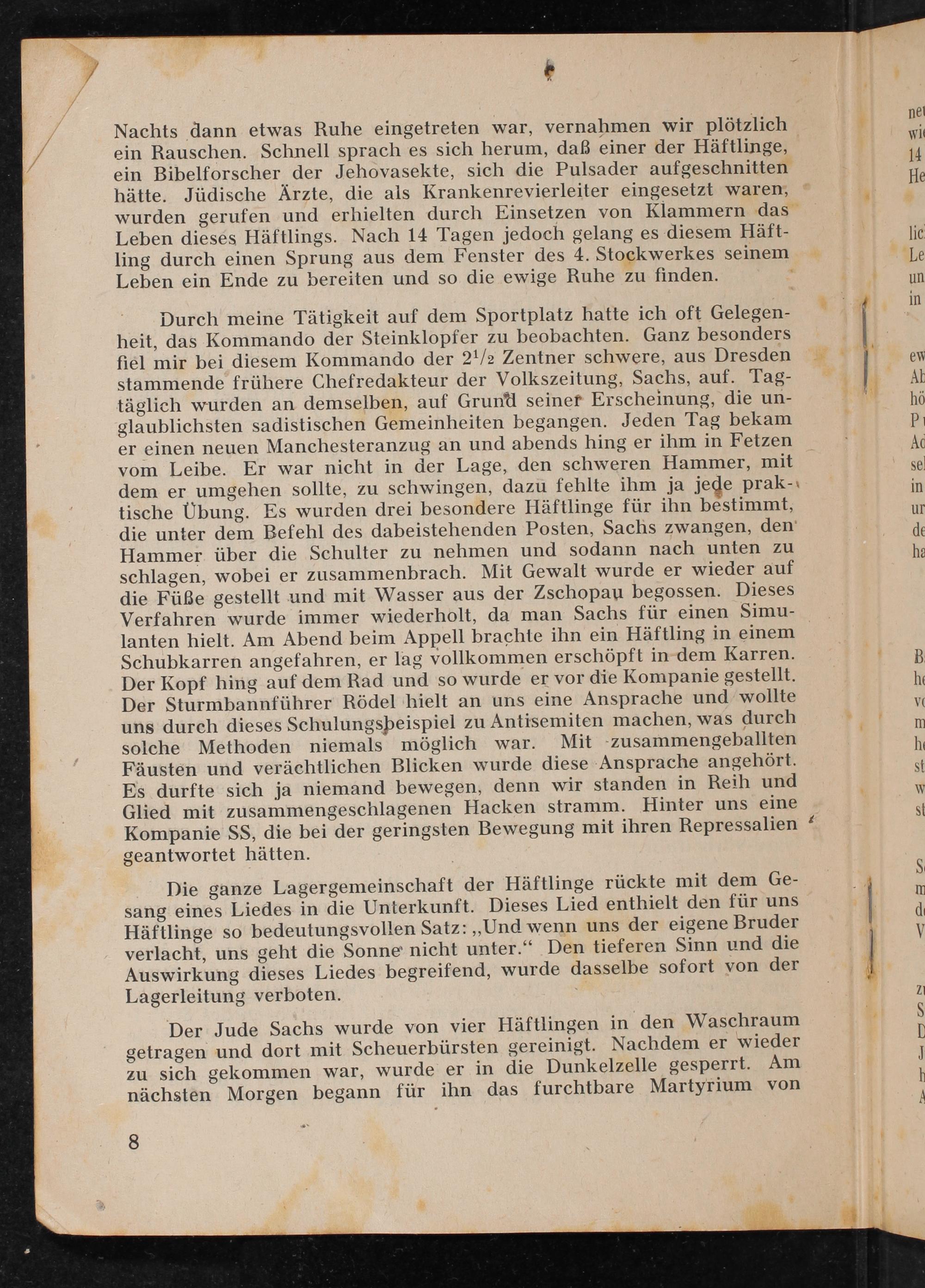 Nachts dann etwas Ruhe eingetreten war, vernahmen wir plötzlich ein Rauschen. Schnell sprach es sich herum, daß einer der Häftlinge, ein Bibelforscher der Jehovasekte, sich die Pulsader aufgeschnitten hätte. Jüdische Ärzte, die als Krankenrevierleiter eingesetzt waren, wurden gerufen und erhielten durch Einsetzen von Klammern das Leben dieses Häftlings. Nach 14 Tagen jedoch gelang es diesem Häftling durch einen Sprung aus dem Fenster des 4. Stockwerkes seinem Leben ein Ende zu bereiten und so die ewige Ruhe zu finden.