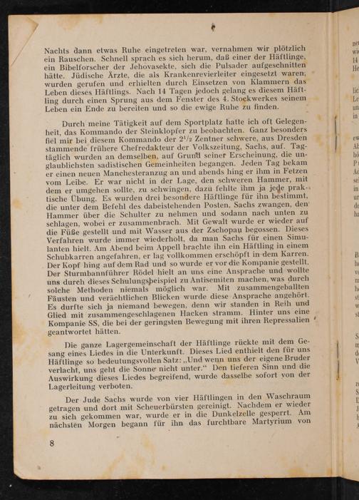 Durch meine Tätigkeit auf dem Sportplatz hatte ich oft Gelegenheit, das Kommando der Steinklopfer zu beobachten. Ganz besonders fiel mir bei diesem Kommando der 21/2 Zentner schwere, aus Dresden stammende frühere Chefredakteur der Volkszeitung, Sachs, auf. Tagtäglich wurden an demselben, auf Grund seiner Erscheinung, die unglaublichsten sadistischen Gemeinheiten begangen. Jeden Tag bekam er einen neuen Manchesteranzug an und abends hing er ihm in Fetzen vom Leibe. Er war nicht in der Lage, den schweren Hammer, mit dem er umgehen sollte, zu schwingen, dazu fehlte ihm ja jede praktische Übung. Es wurden drei besondere Häftlinge für ihn bestimmt, die unter dem Befehl des dabeistehenden Posten, Sachs zwangen, den Hammer über die Schulter zu nehmen und sodann nach unten zu schlagen, wobei er zusammenbrach. Mit Gewalt wurde er wieder auf die Füße gestellt und mit Wasser aus der Zschopau begossen. Dieses Verfahren wurde immer wiederholt, da man Sachs für einen Simulanten hielt. Am Abend beim Appell brachte ihn ein Häftling in einem Schubkarren angefahren, er lag vollkommen erschöpft in dem Karren. Der Kopf hing auf dem Rad und so wurde er vor die Kompanie gestellt. Der Sturmbannführer Rödel hielt an uns eine Ansprache und wollte uns durch dieses Schulungsbeispiel zu Antisemiten machen, was durch solche Methoden niemals möglich war. Mit zusammengeballten Fäusten und verächtlichen Blicken wurde diese Ansprache angehört. Es durfte sich ja niemand bewegen, denn wir standen in Reih und Glied mit zusammengeschlagenen Hacken stramm. Hinter uns eine Kompanie SS , die bei der geringsten Bewegung mit ihren Repressalien geantwortet hätten.