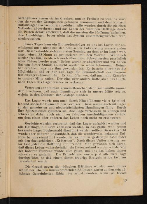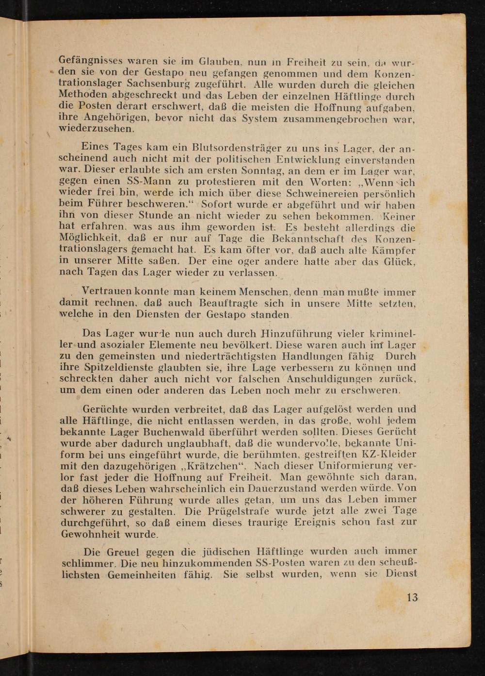 Gefängnisses waren sie im Glauben, nun in Freiheit zu sein, da wurden sie von der Gestapo neu gefangen genommen und dem Konzentrationslager Sachsenburg zugeführt. Alle wurden durch die gleichen Methoden abgeschreckt und das Leben der einzelnen Häftlinge durch die Posten derart erschwert, daß die meisten die Hoffnung aufgaben, ihre Angehörigen, bevor nicht das System zusammengebrochen war, wiederzusehen.