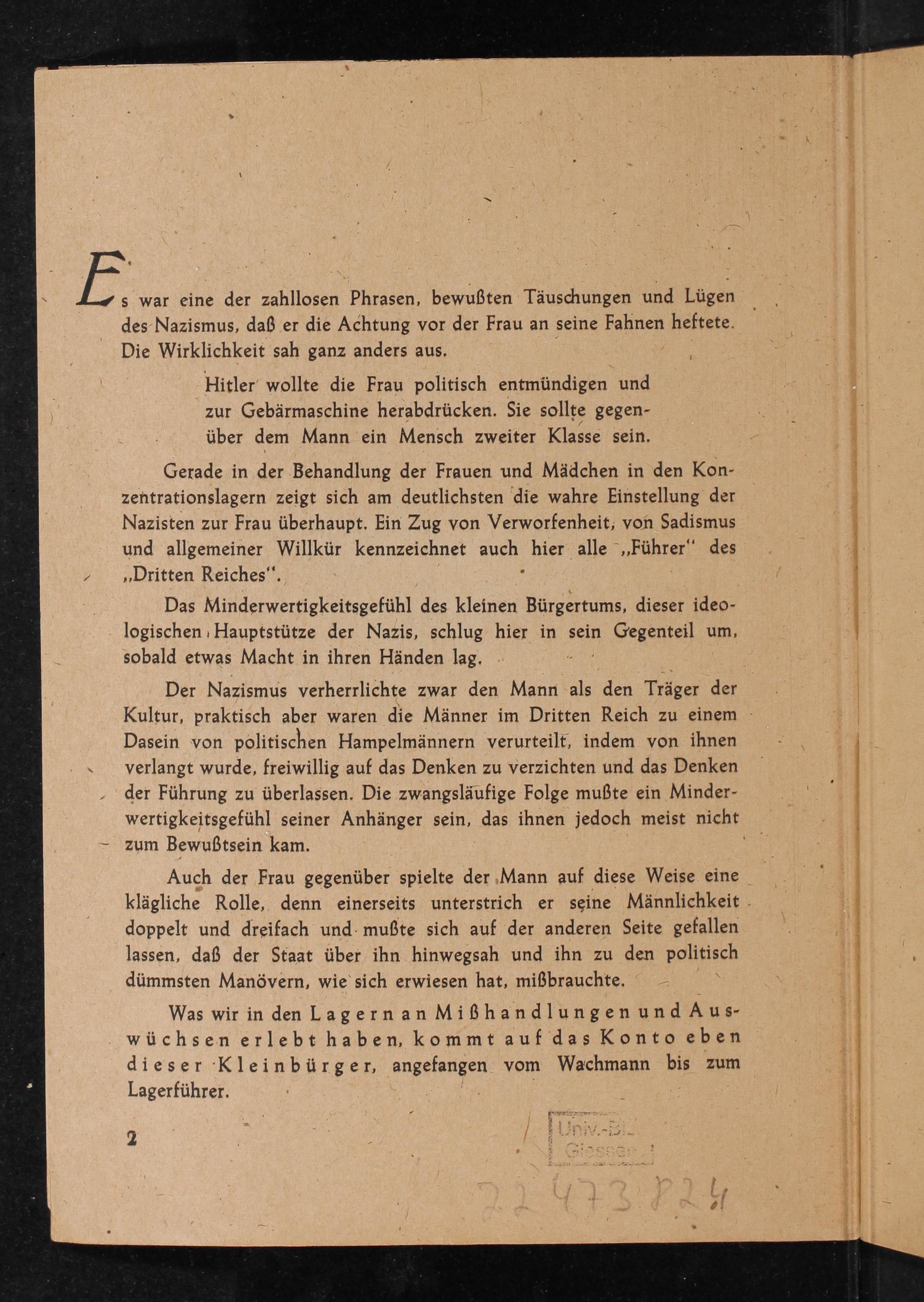 Gerade in der Behandlung der Frauen und Mädchen in den Konzentrationslagern zeigt sich am deutlichsten die wahre Einstellung der Nazisten zur Frau überhaupt. Ein Zug von Verworfenheit, von Sadismus und allgemeiner Willkür kennzeichnet auch hier alle ,, Führer" des ,, Dritten Reiches ".