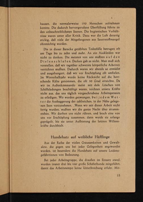 Die in dieser Baracke gezählten Todesfälle betrugen oft am Tage bis zu zehn und mehr. An ein Auskleiden war nicht zu denken. Die meisten von uns mußten auf den Dielenschlafen. Decken gab es nicht. Man muß sich vorstellen, daß wir tagsüber schwerste körperliche Arbeiten verrichten mußten. Dadurch waren wir abends so ermüdet und ausgehungert, daß wir vor Erschöpfung oft umfielen. Im Winterhalbjahr wurde keine Rücksicht auf die herrschende Kälte genommen, die oft 30 Grad erreichte. Da wir im Außenkommando meist mit dem Löschen von Schiffsladungen beschäftigt waren, reichten unsere Kräfte nicht aus, das uns täglich vorgeschriebene Arbeitspensum zu erledigen. Wir wurden gezwungen, bei jedem Wetter die Ausbaggerung der zahlreichen, in der Nähe gelegenen Seen vorzunehmen. Wenn wir mit dieser Arbeit nicht fertig wurden, mußten wir die ganze Nacht über strammstehen. Wir durften uns nicht rühren, und brach eine von uns vor Erschöpfung zusammen, dann wurde sie solange geprügelt, bis sie unter Aufbietung der letzten Willenskräfte durchhielt.