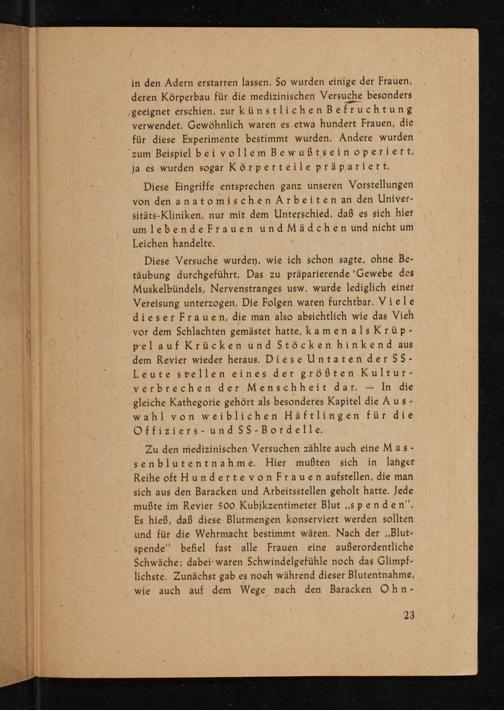 Diese Versuché wurden, wie ich schon sagte, ohne Betäubung durchgeführt. Das zu präparierende' Gewebe des Muskelbündels, Nervenstranges usw. wurde lediglich einer Vereisung unterzogen. Die Folgen waren furchtbar. Viele dieser Frauen, die man also absichtlich wie das Vieh vor dem Schlachten gemästet hatte, kamen als Krüppel auf Krücken und Stöcken hinkend aus dem Revier wieder heraus. Diese Untaten der SSLeute stellen eines der größten Kulturverbrechen der Menschheit dar. In die gleiche Kathegorie gehört als besonderes Kapitel die A us- wahl von weiblichen Häftlingen für die Offiziers- und SS - Bordelle.