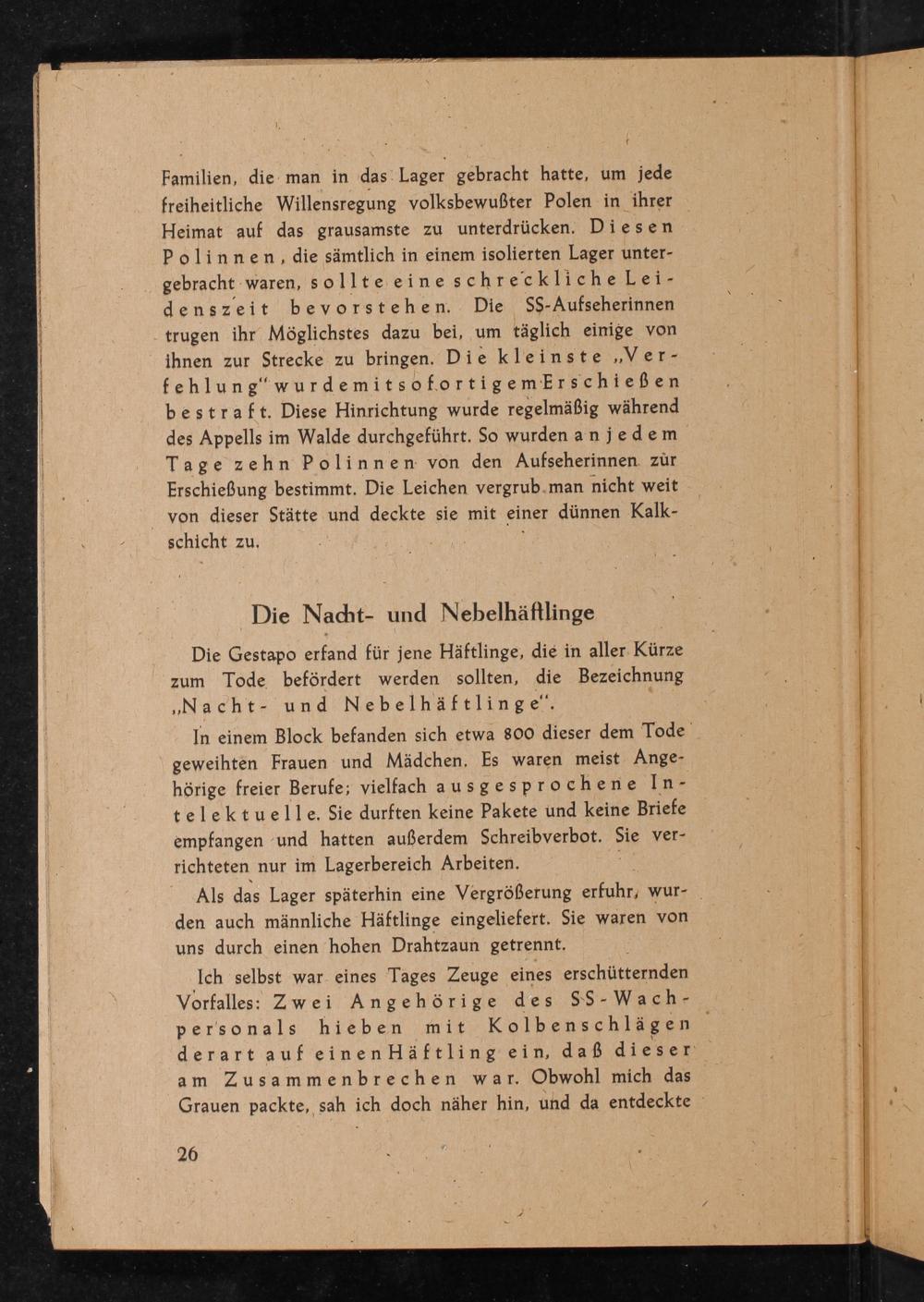 Familien, die man in das Lager gebracht hatte, um jede freiheitliche Willensregung volksbewußter Polen in ihrer Heimat auf das grausamste zu unterdrücken. Diesen Polinnen, die sämtlich in einem isolierten Lager untergebracht waren, sollte eine schreckliche Leidenszeit bevorstehen. Die SS - Aufseherinnen trugen ihr Möglichstes dazu bei, um täglich einige von ihnen zur Strecke zu bringen. Die kleinste Verfehlung" wurde mitsofortigem Erschießen bestraft. Diese Hinrichtung wurde regelmäßig während des Appells im Walde durchgeführt. So wurden an jedem Tage zehn Polinnen von den Aufseherinnen zur Erschießung bestimmt. Die Leichen vergrub.man nicht weit von dieser Stätte und deckte sie mit einer dünnen Kalkschicht zu.