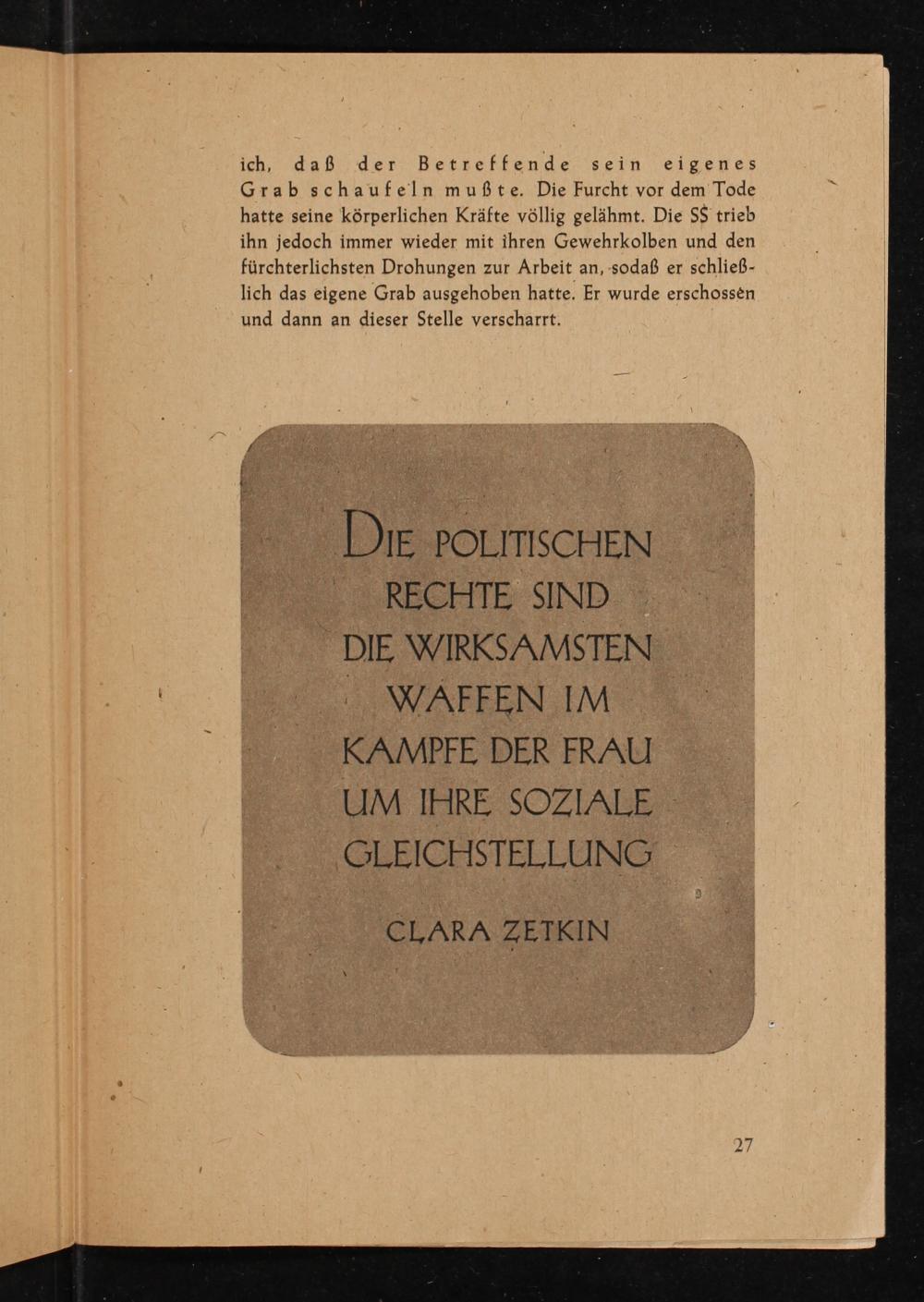 ich, daß der Betreffende sein eigenes Grab schaufeln mußte. Die Furcht vor dem Tode hatte seine körperlichen Kräfte völlig gelähmt. Die SS trieb ihn jedoch immer wieder mit ihren Gewehrkolben und den fürchterlichsten Drohungen zur Arbeit an, sodaß er schließlich das eigene Grab ausgehoben hatte. Er wurde erschossen und dann an dieser Stelle verscharrt.