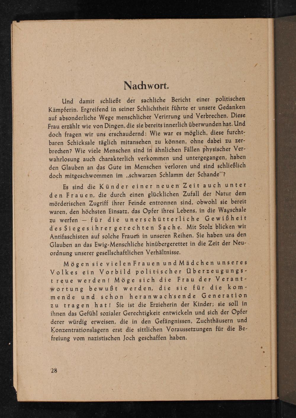 Es sind die Künder einer neuen Zeit auch unter den Frauen, die durch einen glücklichen Zufall der Natur dem mörderischen Zugriff ihrer Feinde entronnen sind, obwohl sie bereit waren, den höchsten Einsatz, das Opfer ihres Lebens, in die Wagschale zu werfen- für die unerschütterliche Gewißheit d'es Sieges ihrer gerechten Sache. Mit Stolz blicken wir Antifaschisten auf solche Frauen in unseren Reihen. Sie haben uns den Glauben an das Ewig- Menschliche hinübergerettet in die Zeit der Neuordnung unserer gesellschaftlichen Verhältnisse.