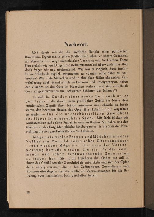 Mögen sie vielen Frauen und Mädchen unseres Volkes ein Vorbild politischer Überzeugungstreue werden! Möge sich die Frau der Verantwortung bewußt werden, die sie für die kommende und schon heranwachsende Generation zu tragen hat! Sie ist die Erzieherin der Kinder; sie soll in ihnen das Gefühl sozialer Gerechtigkeit entwickeln und sich der Opfer derer würdig erweisen, die in den Gefängnissen, Zuchthäusern und Konzentrationslagern erst die sittlichen Voraussetzungen für die Befreiung vom nazistischen Joch geschaffen haben.
