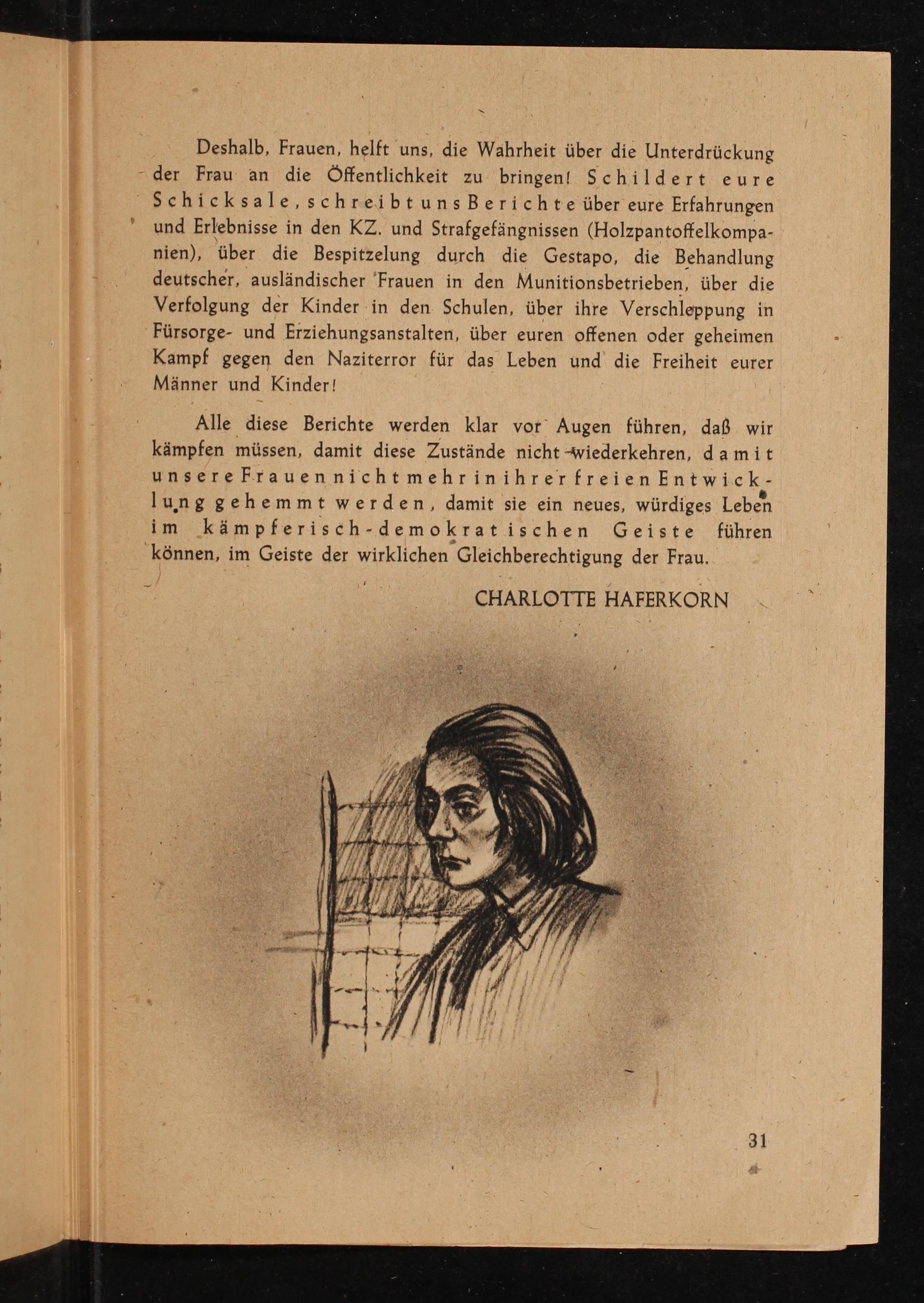 Deshalb, Frauen, helft uns, die Wahrheit über die Unterdrückung der Frau an die Öffentlichkeit zu bringen! Schildert eure Schicksale, schreibt uns Berichte über eure Erfahrungen und Erlebnisse in den KZ. und Strafgefängnissen( Holzpantoffelkompanien), über die Bespitzelung durch die Gestapo , die Behandlung deutscher, ausländischer' Frauen in den Munitionsbetrieben, über die Verfolgung der Kinder in den Schulen, über ihre Verschleppung in Fürsorge- und Erziehungsanstalten, über euren offenen oder geheimen Kampf gegen den Naziterror für das Leben und die Freiheit eurer Männer und Kinder!