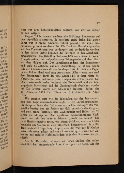 Gegen 7 Uhr abends mußten alle Häftlinge blockweise auf dem Appellplatz antreten. Es herrschte eisige Stille. Das ganze Lager war in grelles Scheinwerferlicht getaucht, als wenn eine Filmszene gedreht werden sollte. Die Zahl der Maschinengewehre auf den Postentürmen war verdoppelt und verdreifacht worden. In dem kalten Lichte blinkten die Patronen in den Maschinengewehrgurten. Ein Bataillon Totenkopf- SS marschierte in voller Kriegsbemalung mit aufgepflanztem Seitengewehr auf dem Platz vor dem Galgen auf. Der Lagerkommandant, der Lagerführer und viele SS - Offiziere nahmen Aufstellung. Bei ihnen befand sich der Oberstaatsanwalt des Sondergerichts. Er hielt ein Papier in der linken Hand und trug Amtstracht. Alles starrte nun nach dem Eingangstor, durch das eine Gruppe SS , in ihrer Mitte der Verurteilte, kam und sofort beim Galgen Aufstellung nahm. Der Oberstaatsanwalt verlas nochmals das Todesurteil und die telegraphische Mitteilung, daß das Gnadengesuch abgelehnt worden sei. Die letzten Worte der Ablehnung lauteten: Berlin, den 21. Dezember 1938. Der Führer und Reichskanzler gez. Adolf Hitler .