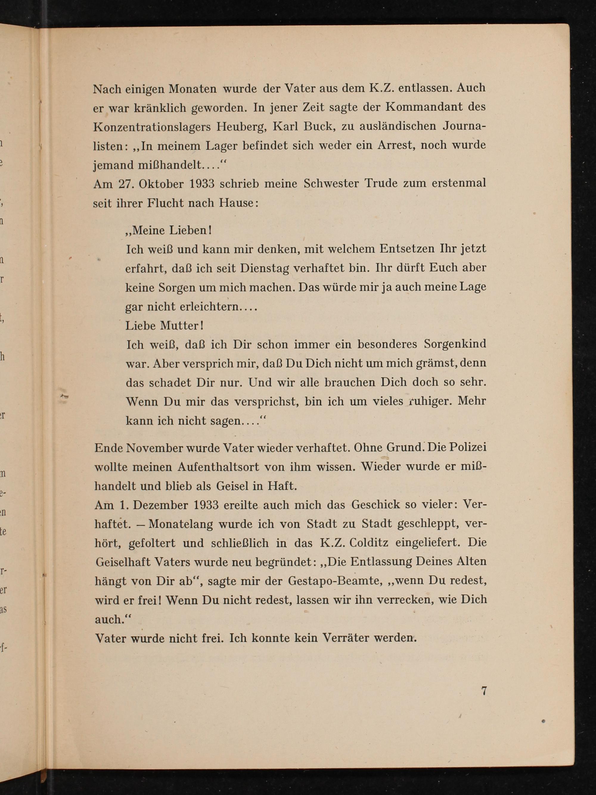 Am 1. Dezember 1933 ereilte auch mich das Geschick so vieler: Ver- haftet.— Monatelang wurde ich von Stadt zu Stadt geschleppt, ver- hört, gefoltert und schließlich in das K.Z. Colditz eingeliefert. Die Geiselhaft Vaters wurde neu begründet: ‚Die Entlassung Deines Alten hängt von Dir ab“, sagte mir der Gestapo -Beamte, ‚„‚wenn Du redest, wird er freil Wenn Du nicht redest, lassen wir ihn verrecken, wie Dich auch.“