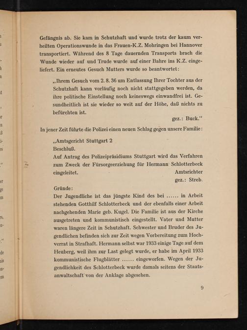 stehenden Gotthilf Schlotterbeck und der ebenfalls einer Arbeit nachgehenden Marie geb. Kugel. Die Familie ist aus der Kirche ausgetreten und kommunistisch eingestellt. Vater und Mutter waren längere Zeit in Schutzhaft. Schwester und Bruder des Ju- gendlichen befinden sich zur Zeit wegen Vorbereitung zum Hoch- verrat in Strafhaft. Hermann selbst war 1933 einige Tage auf dem Heuberg, weil ihm zur Last gelegt wurde, er habe im April 1933 kommunistische Flugblätter...... eingeworfen. Wegen der Ju- gendlichkeit des Schlotterbeck wurde damals seitens der Staats- anwaltschaft von der Anklage abgesehen.
