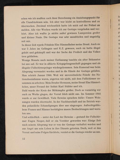 Wenige Monate nach meiner Entlassung tauchte ein alter Bekannter bei uns auf. Er war in alliierte Kriegsgefangenschaft gegangen und als illegaler Fallschirmspringer wiedergekommen. Sein Kamerad war beim Absprung verwundet worden und in die Hände der Gestapo gefallen. Man schrieb Januar 1944. Weil wir unversöhnliche Feinde des Na- tionalsozialismus waren, zögerten wir nicht, mit dem Fallschirmer zu- sammen zu arbeiten: Mein. Bruder Hermann, meine Braut Else Himmel- heber, unser Freund der Soldat Karl Stäbler und ich.