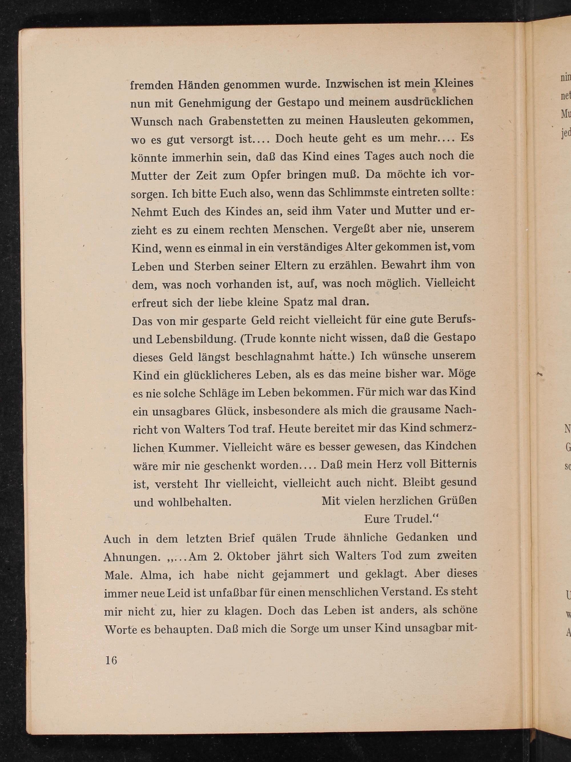 Das von mir gesparte Geld reicht vielleicht für eine gute Berufs- und Lebensbildung.(Trude konnte nicht wissen, daß die Gestapo dieses Geld längst beschlagnahmt hatte.) Ich wünsche unserem Kind ein glücklicheres Leben, als es das meine bisher war. Möge es nie solche Schläge im Leben bekommen. Für mich war das Kind ein unsagbares Glück, insbesondere als mich die grausame Nach- richt von Walters Tod traf. Heute bereitet mir das Kind schmerz- lichen Kummer. Vielleicht wäre es besser gewesen, das Kindchen wäre mir nie geschenkt worden.... Daß mein Herz voll Bitternis ist, versteht Ihr vielleicht, vielleicht auch nicht. Bleibt gesund und wohlbehalten. Mit vielen herzlichen Grüßen