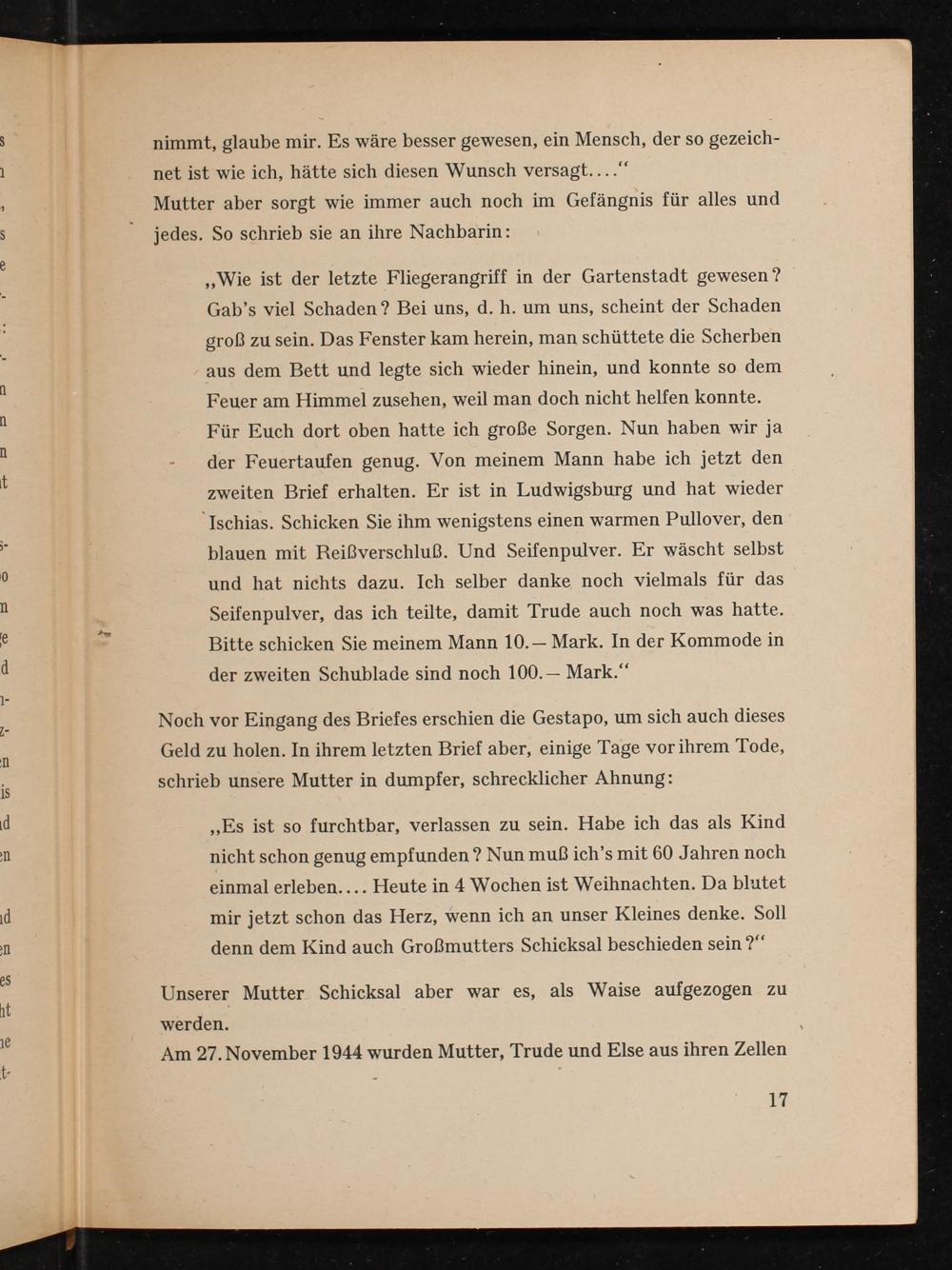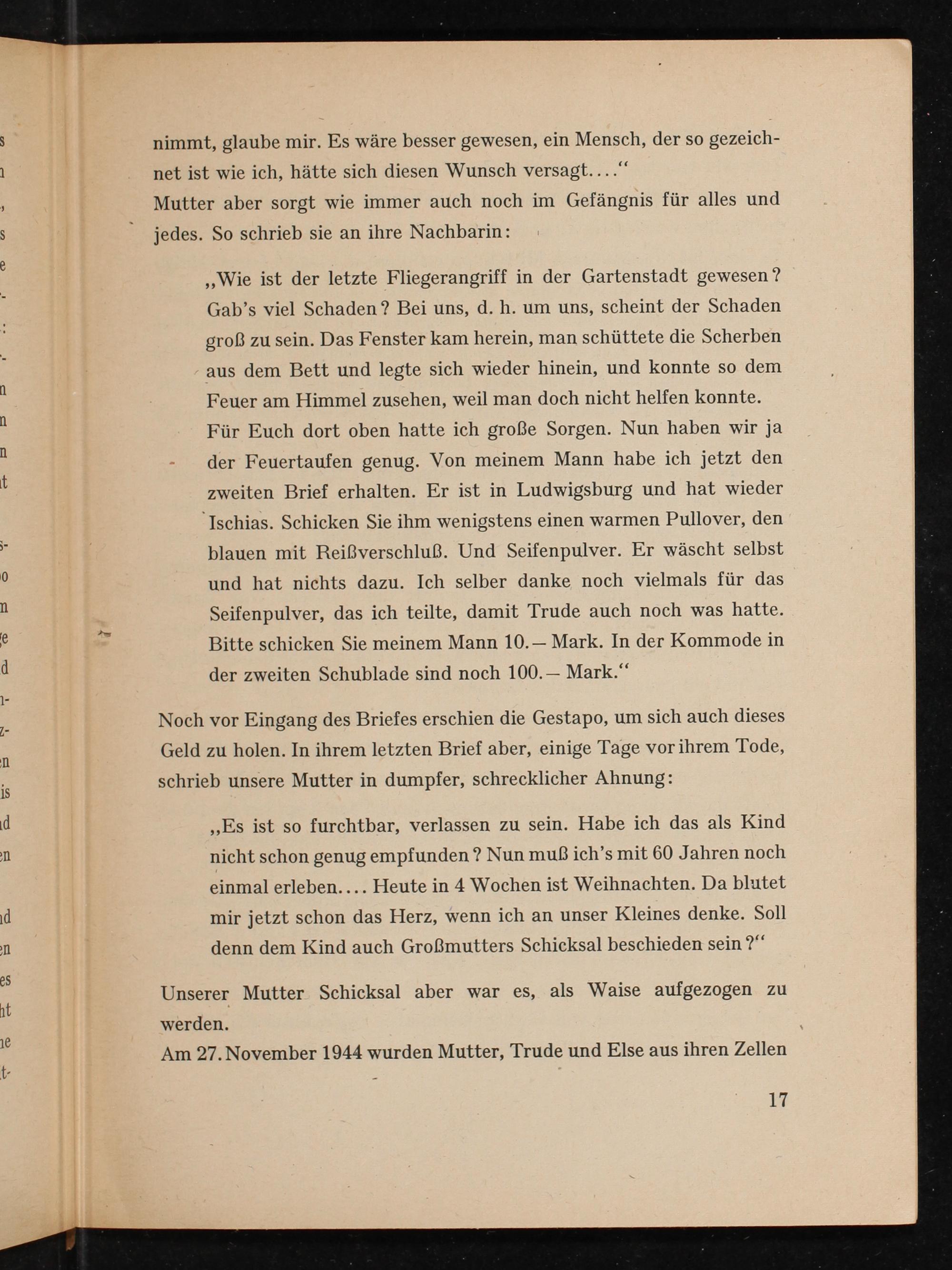nimmt, glaube mir. Es wäre besser gewesen, ein Mensch, der so gezeich- net ist wie ich, hätte sich diesen Wunsch versagt....‘“ Mutter aber sorgt wie immer auch noch im Gefängnis für alles und