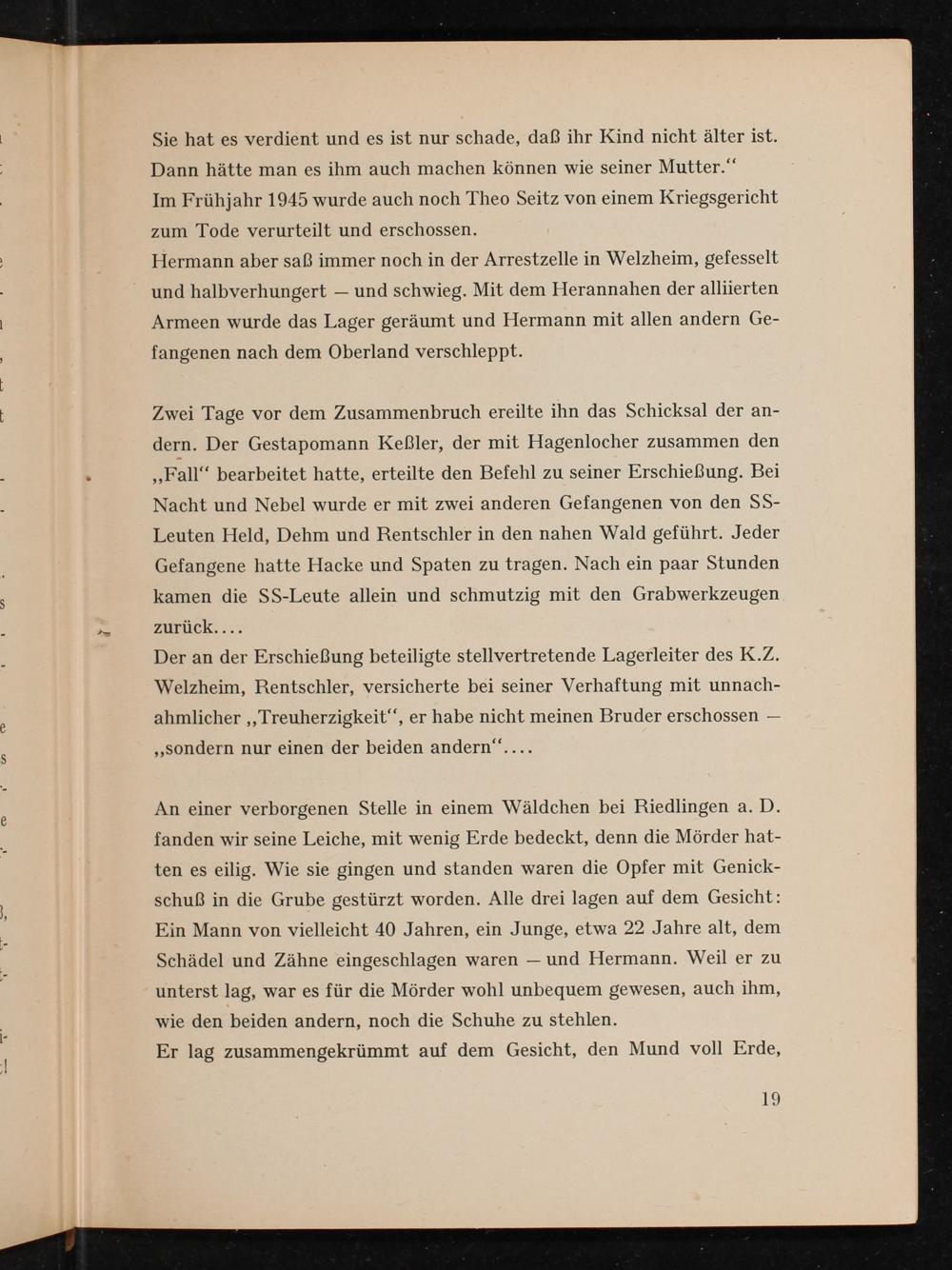 Der an der Erschießung beteiligte stellvertretende Lagerleiter des K.Z. Welzheim , Rentschler, versicherte bei seiner Verhaftung mit unnachahmlicher ,, Treuherzigkeit", er habe nicht meinen Bruder erschossen ,, sondern nur einen der beiden andern"....