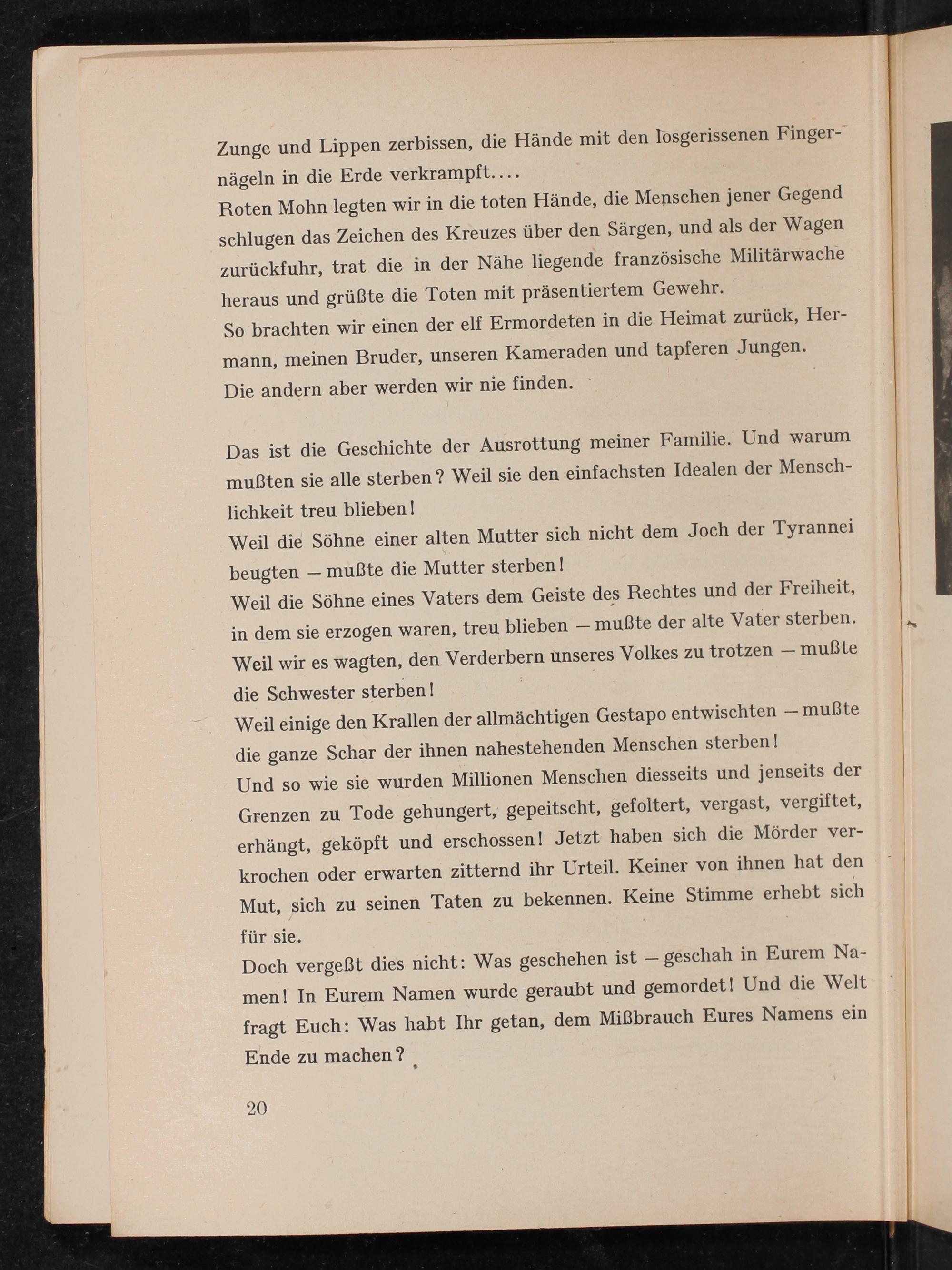 Das ist die Geschichte der Ausrottung meiner Familie. Und warum mußten sie alle sterben? Weil sie den einfachsten Idealen der Mensch- lichkeit treu blieben! Weil die Söhne einer alten Mutter sich nicht dem Joch der Tyrannei beugten— mußte die Mutter sterben! Weil die Söhne eines Vaters dem Geiste des Rechtes und der Freiheit, in dem sie erzogen waren, treu blieben— mußte der alte Vater sterben. Weil wir es wagten, den Verderbern unseres Volkes zu trotzen— mußte die Schwester sterben| Weil einige den Krallen der allmächtigen Gestapo entwischten— mußte die ganze Schar der ihnen nahestehenden Menschen sterben! Und so wie sie wurden Millionen Menschen diesseits und jenseits der Grenzen zu Tode gehungert, gepeitscht, gefoltert, vergast, vergiftet, erhängt, geköpft und erschossen! Jetzt haben sich die Mörder ver- krochen oder erwarten zitternd ihr Urteil. Keiner von ihnen hat den Mut, sich zu seinen Taten zu bekennen. Keine Stimme erhebt sich für sie. Doch vergeßt dies nicht: Was geschehen ist— geschah in Eurem Na- men! In Eurem Namen wurde geraubt und gemordet! Und die Welt fragt Euch: Was habt Ihr getan, dem Mißbrauch Eures Namens ein