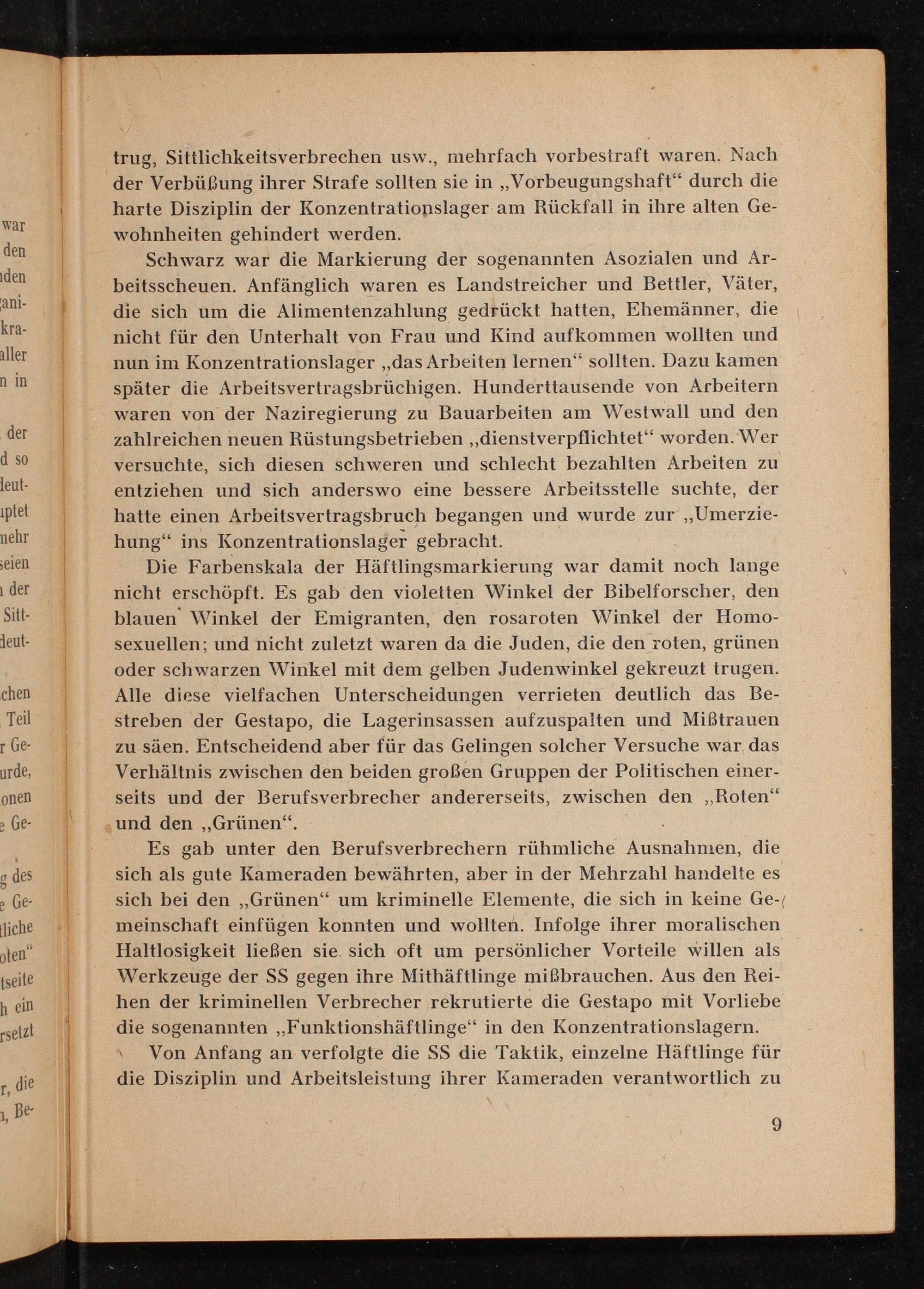 Schwarz war die Markierung der sogenannten Asozialen und Arbeitsscheuen. Anfänglich waren es Landstreicher und Bettler, Väter, die sich um die Alimentenzahlung gedrückt hatten, Ehemänner, die nicht für den Unterhalt von Frau und Kind aufkommen wollten und nun im Konzentrationslager ,, das Arbeiten lernen" sollten. Dazu kamen später die Arbeitsvertragsbrüchigen. Hunderttausende von Arbeitern waren von der Naziregierung zu Bauarbeiten am Westwall und den zahlreichen neuen Rüstungsbetrieben ,, dienstverpflichtet" worden. Wer versuchte, sich diesen schweren und schlecht bezahlten Arbeiten zu entziehen und sich anderswo eine bessere Arbeitsstelle suchte, der hatte einen Arbeitsvertragsbruch begangen und wurde zur ,, Umerziehung" ins Konzentrationslager gebracht.