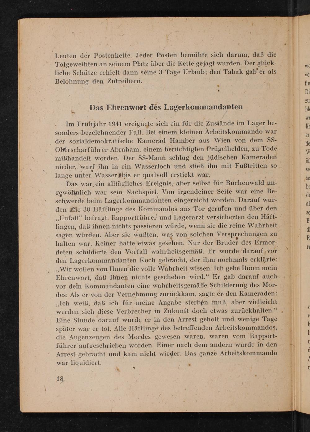 Das war, ein alltägliches Ereignis, aber selbst für Buchenwald ungewöhnlich war sein Nachspiel. Von irgendeiner Seite war eine Beschwerde beim Lagerkommandanten eingéreicht worden. Darauf wurden ale 30 Häftlinge des Kommandos ans Tor gerufen und über den ,, Unfall" befragt. Rapportführer und Lagerarzt versicherten den Häftlingen, daß ihnen nichts passieren würde, wenn sie die reine Wahrheit sagen würden. Aber sie wußten, was von solchen Versprechungen zu halten war. Keiner hatte etwas gesehen. Nur der Bruder des Ermordeten schilderte den Vorfall wahrheitsgemäß. Er wurde darauf vor den Lagerkommandanten Koch gebracht, der ihm nochmals erklärte: Wir wollen von Ihnen die volle Wahrheit wissen. Ich gebe Ihnen mein Ehrenwort, daß Ihnen nichts geschehen wird." Er gab darauf auch vor dem Kommandanten eine wahrheitsgemäße Schilderung des Mordes: Als er von der Vernehmung zurückkam, sagte er den Kameraden: ,, Ich weiß, daß ich für meine Angabe sterben muß, aber vielleicht werden, sich diese Verbrecher in Zukunft doch etwas zurückhalten." Eine Stunde darauf wurde er in den Arrest geholt und wenige Tage später war er tot. Alle Häftlinge des betreffenden Arbeitskommandos, die Augenzeugen des Mordes gewesen waren, waren vom Rapportführer aufgeschrieben worden. Einer nach dem andern wurde in den Arrest gebracht und kam nicht wieder. Das ganze Arbeitskommando war liquidiert.