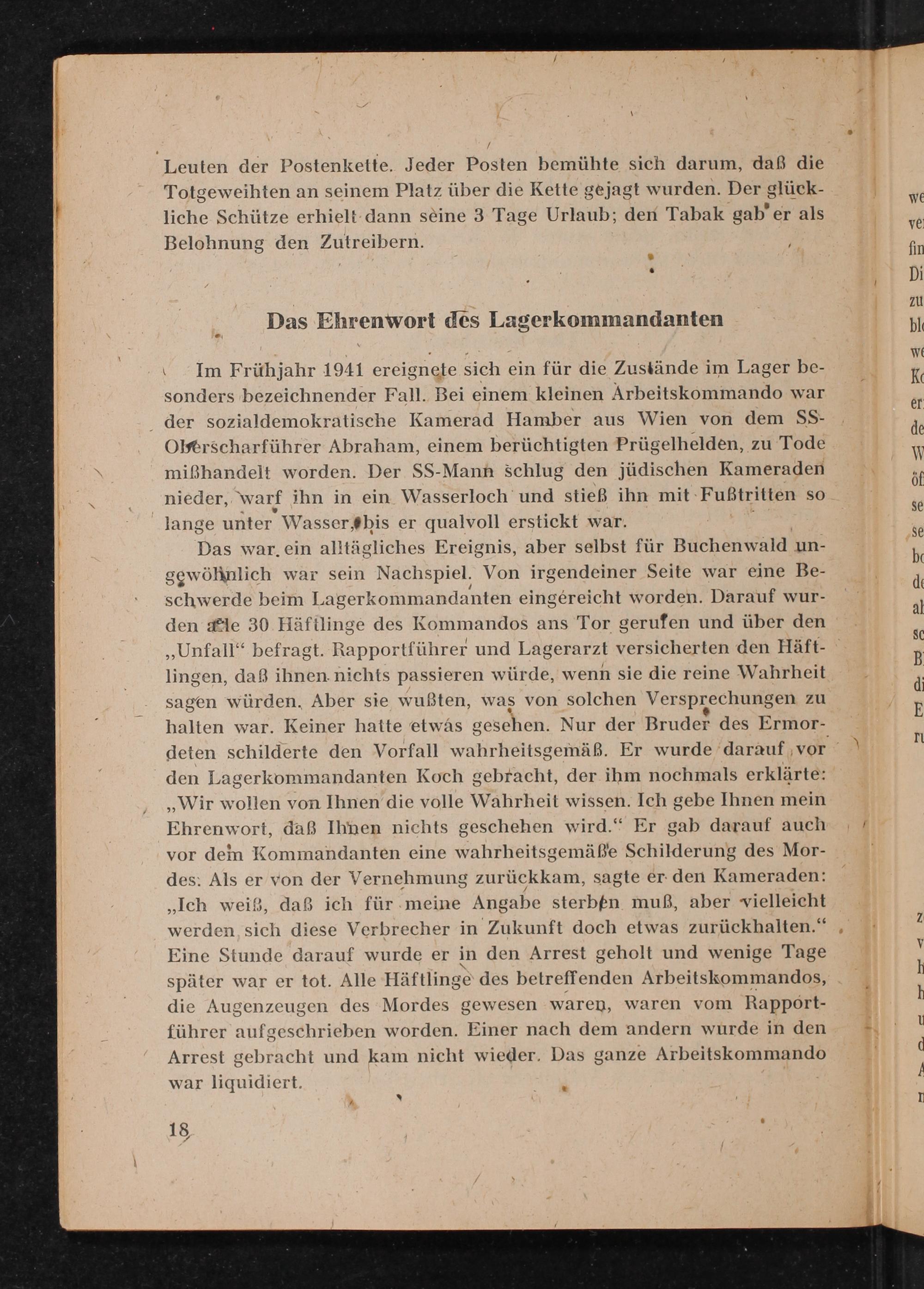 Im Frühjahr 1941 ereignete sich ein für die Zustände im Lager besonders bezeichnender Fall. Bei einem kleinen Arbeitskommando war der sozialdemokratische Kamerad Hamber aus Wien von dem SSOberscharführer Abraham, einem berüchtigten Prügelhelden, zu Tode mißhandelt worden. Der SS- Mann schlug den jüdischen Kameraden nieder, warf ihn in ein Wasserloch und stieß ihn mit Fußtritten so lange unter Wasser, bis er qualvoll erstickt war.