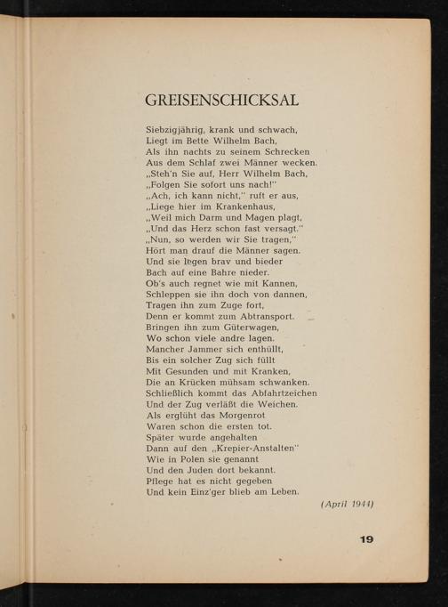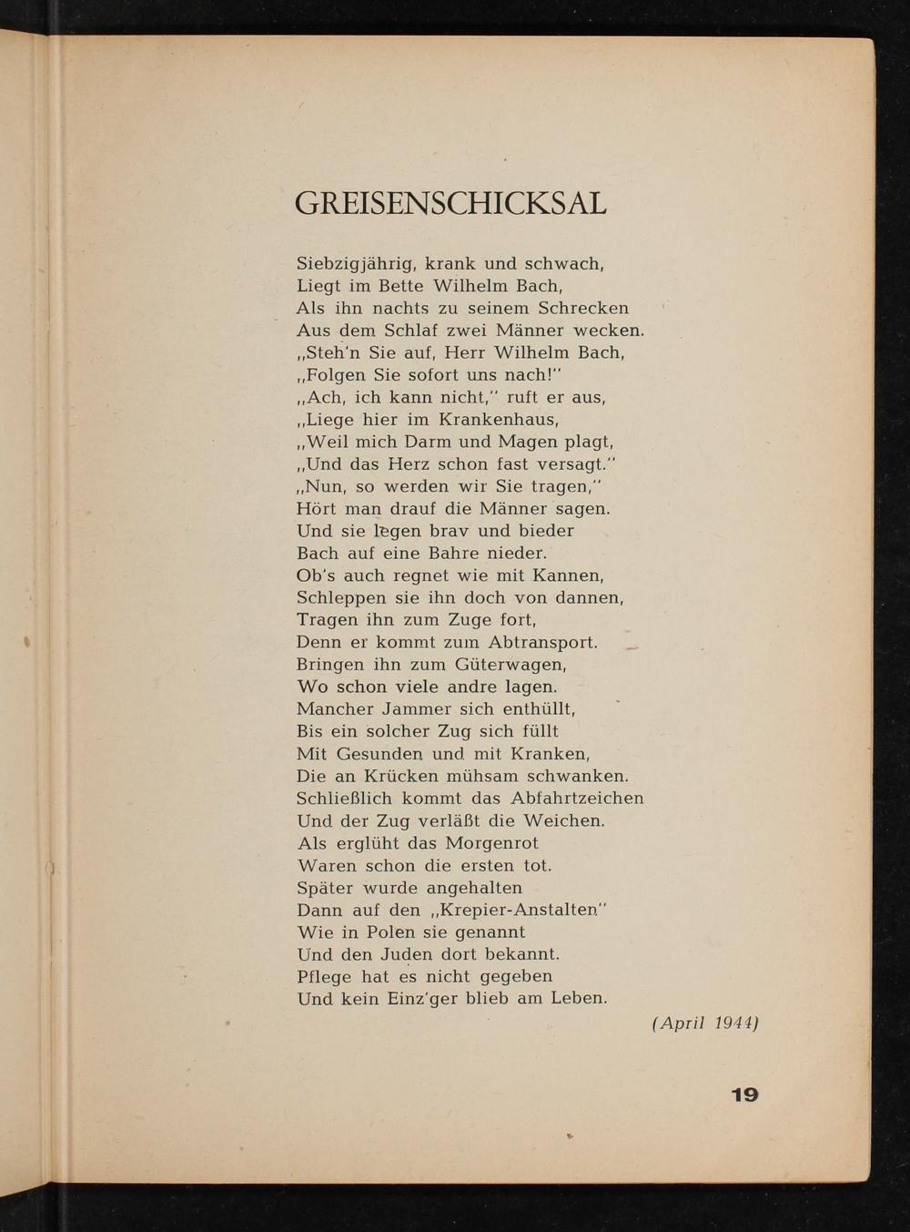 Denn er kommt zum Abtransport. Bringen ihn zum Güterwagen, Wo schon viele andre lagen. Mancher Jammer sich enthüllt,