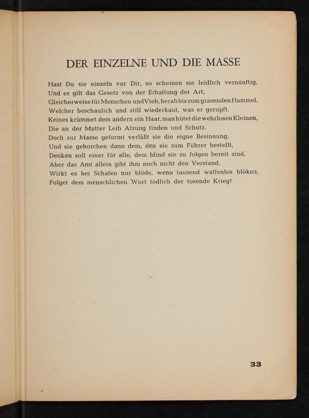 Wirkt es bei Schafen nur blöde, wenn tausend waffenlos blöken, Folget dem menschlichen Wort tödlich der tosende Krieg!