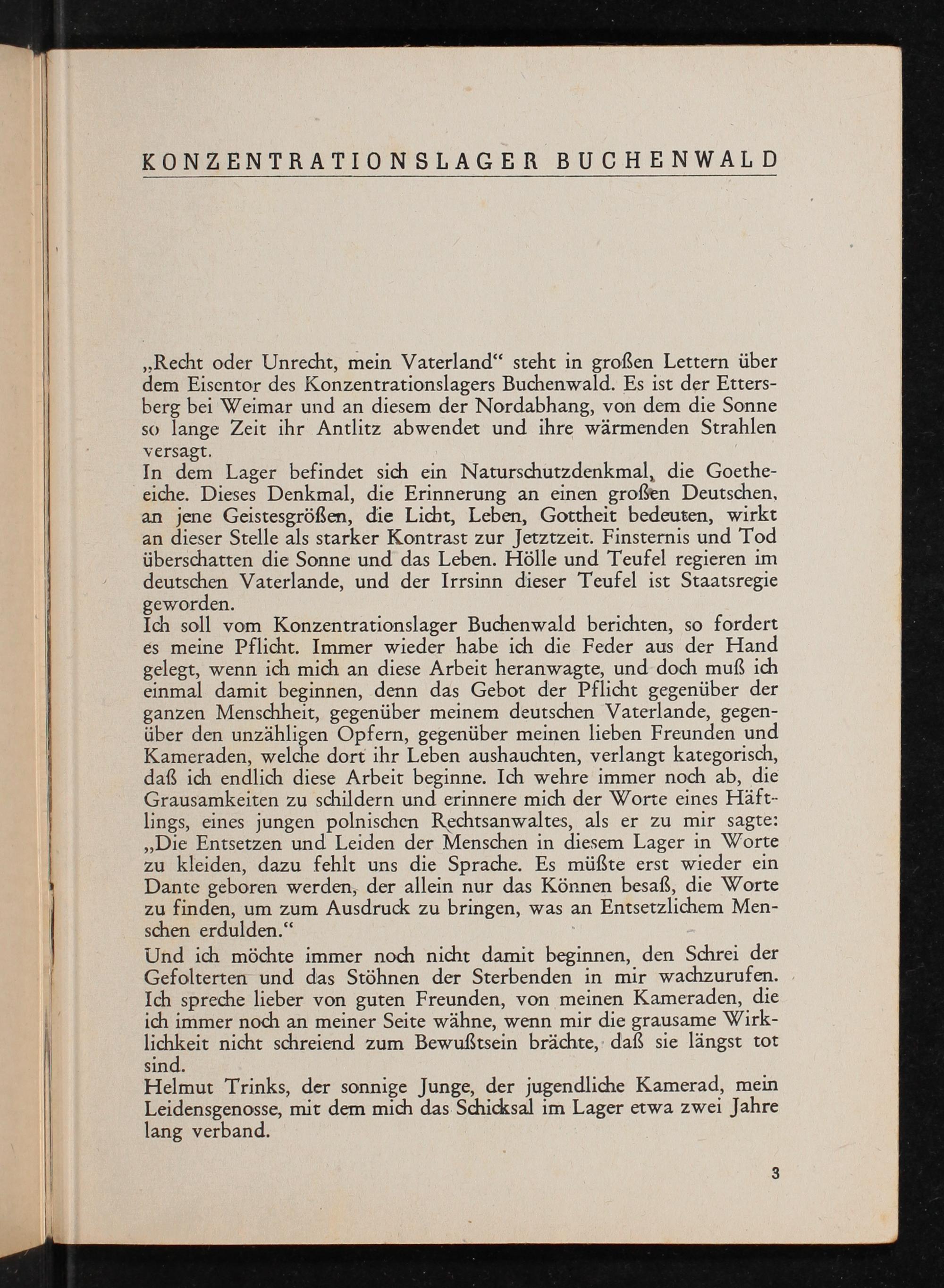 Ich soll vom Konzentrationslager Buchenwald berichten, so fordert es meine Pflicht. Immer wieder habe ich die Feder aus der Hand gelegt, wenn ich mich an diese Arbeit heranwagte, und doch muß ich einmal damit beginnen, denn das Gebot der Pflicht gegenüber der ganzen Menschheit, gegenüber meinem deutschen Vaterlande, gegen- über den unzähligen Opfern, gegenüber meinen lieben Freunden und Kameraden, welche dort ihr Leben aushauchten, verlangt kategorisch, daß ich endlich diese Arbeit beginne. Ich wehre immer noch ab, die Grausamkeiten zu schildern und erinnere mich der Worte eines Häft- lings, eines jungen polnischen Rechtsanwaltes, als er zu mir sagte: „Die Entsetzen und Leiden der Menschen in diesem Lager in Worte zu kleiden, dazu fehlt uns die Sprache. Es müßte erst wieder ein Dante geboren werden, der allein nur das Können besaß, die Worte zu finden, um zum Ausdruck zu bringen, was an Entsetzlichem Men- schen erdulden.“