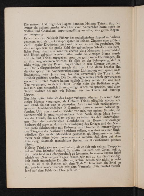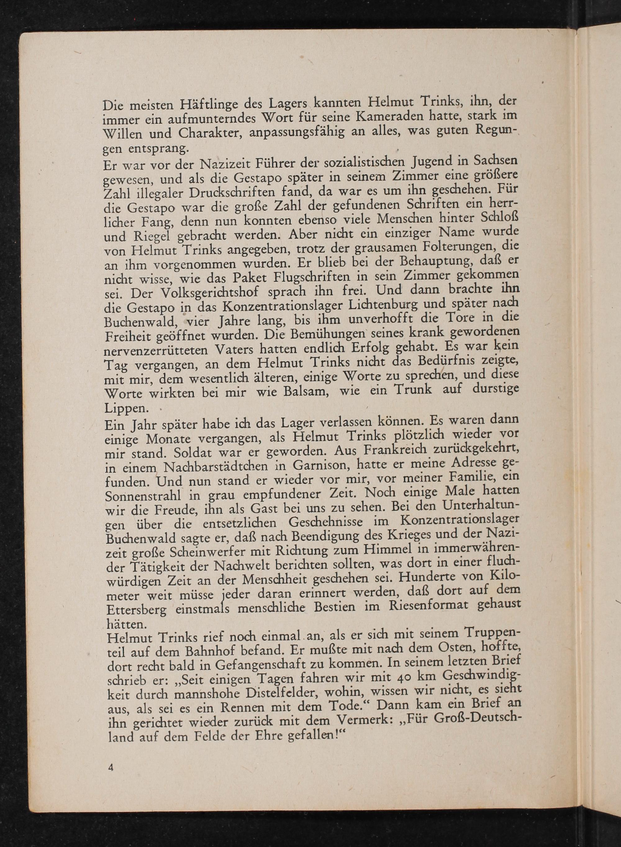 Er war vor der Nazizeit Führer der sozialistischen Jugend in Sachsen gewesen, und als die Gestapo später in seinem Zimmer eine größere Zahl illegaler Druckschriften fand, da war es um ihn geschehen. Für die Gestapo war die große Zahl der gefundenen Schriften ein herrlicher Fang, denn nun konnten ebenso viele Menschen hinter Schloß und Riegel gebracht werden. Aber nicht ein einziger Name wurde von Helmut Trinks angegeben, trotz der grausamen Folterungen, die an ihm vorgenommen wurden. Er blieb bei der Behauptung, daß er nicht wisse, wie das Paket Flugschriften in sein Zimmer gekommen sei. Der Volksgerichtshof sprach ihn frei. Und dann brachte ihn die Gestapo in das Konzentrationslager Lichtenburg und später nach Buchenwald , vier Jahre lang, bis ihm unverhofft die Tore in die Freiheit geöffnet wurden. Die Bemühungen seines krank gewordenen nervenzerrütteten Vaters hatten endlich Erfolg gehabt. Es war kein Tag vergangen, an dem Helmut Trinks nicht das Bedürfnis zeigte, mit mir, dem wesentlich älteren, einige Worte zu sprechen, und diese Worte wirkten bei mir wie Balsam, wie ein Trunk auf durstige Lippen.