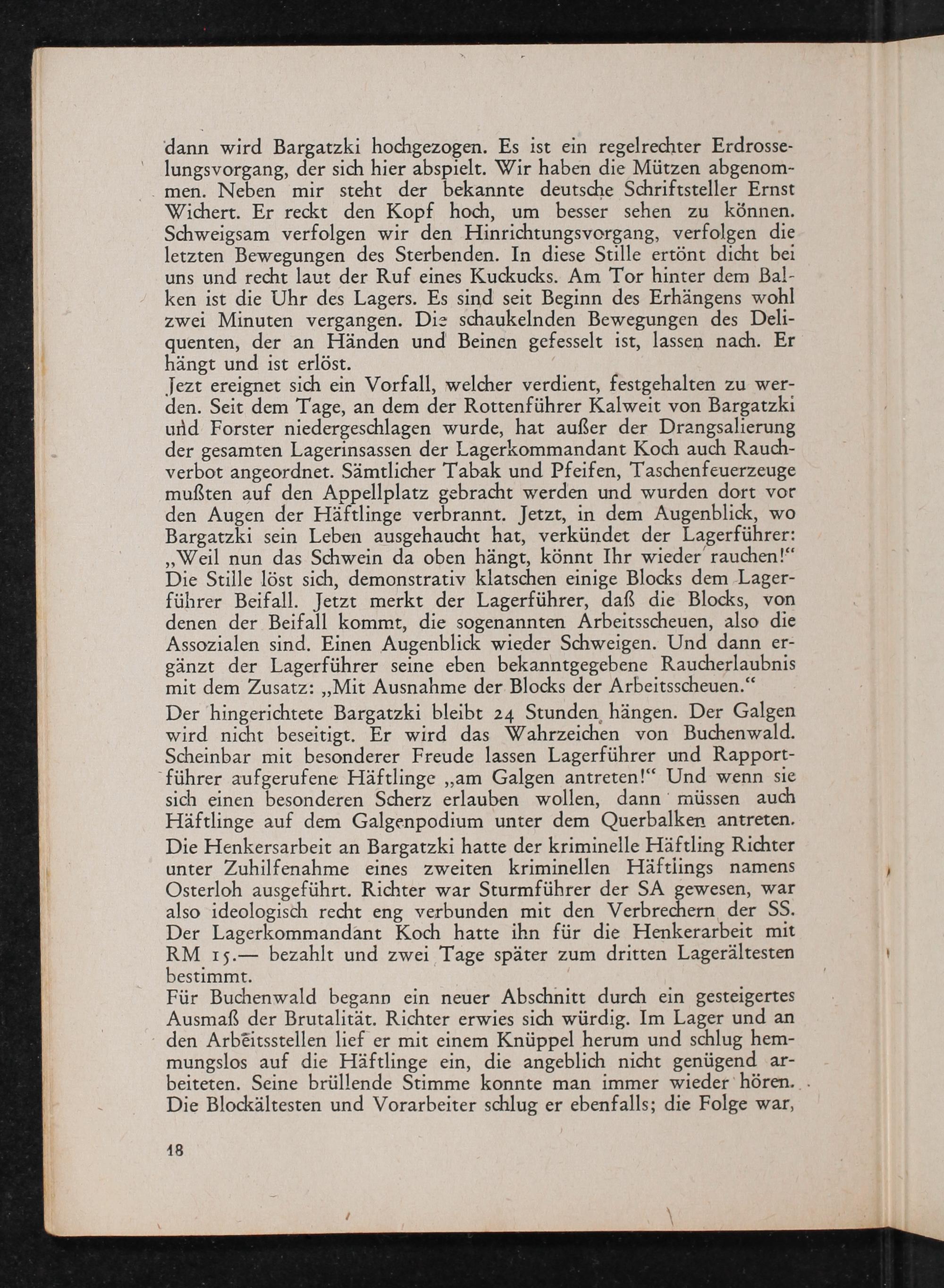 Jezt ereignet sich ein Vorfall, welcher verdient, festgehalten zu werden. Seit dem Tage, an dem der Rottenführer Kalweit von Bargatzki und Forster niedergeschlagen wurde, hat außer der Drangsalierung der gesamten Lagerinsassen der Lagerkommandant Koch auch Rauchverbot angeordnet. Sämtlicher Tabak und Pfeifen, Taschenfeuerzeuge mußten auf den Appellplatz gebracht werden und wurden dort vor den Augen der Häftlinge verbrannt. Jetzt, in dem Augenblick, wo Bargatzki sein Leben ausgehaucht hat, verkündet der Lagerführer: , Weil nun das Schwein da oben hängt, könnt Ihr wieder rauchen!" Die Stille löst sich, demonstrativ klatschen einige Blocks dem Lagerführer Beifall. Jetzt merkt der Lagerführer, daß die Blocks, von denen der Beifall kommt, die sogenannten Arbeitsscheuen, also die Assozialen sind. Einen Augenblick wieder Schweigen. Und dann ergänzt der Lagerführer seine eben bekanntgegebene Raucherlaubnis mit dem Zusatz: ,, Mit Ausnahme der Blocks der Arbeitsscheuen." Der hingerichtete Bargatzki bleibt 24 Stunden, hängen. Der Galgen wird nicht beseitigt. Er wird das Wahrzeichen von Buchenwald . Scheinbar mit besonderer Freude lassen Lagerführer und Rapportführer aufgerufene Häftlinge ,, am Galgen antreten!" Und wenn sie sich einen besonderen Scherz erlauben wollen, dann müssen auch Häftlinge auf dem Galgenpodium unter dem Querbalken antreten. Die Henkersarbeit an Bargatzki hatte der kriminelle Häftling Richter unter Zuhilfenahme eines zweiten kriminellen Häftlings namens Osterloh ausgeführt. Richter war Sturmführer der SA gewesen, war also ideologisch recht eng verbunden mit den Verbrechern der SS. Der Lagerkommandant Koch hatte ihn für die Henkerarbeit mit RM 15. bezahlt und zwei Tage später zum dritten Lagerältesten bestimmt.