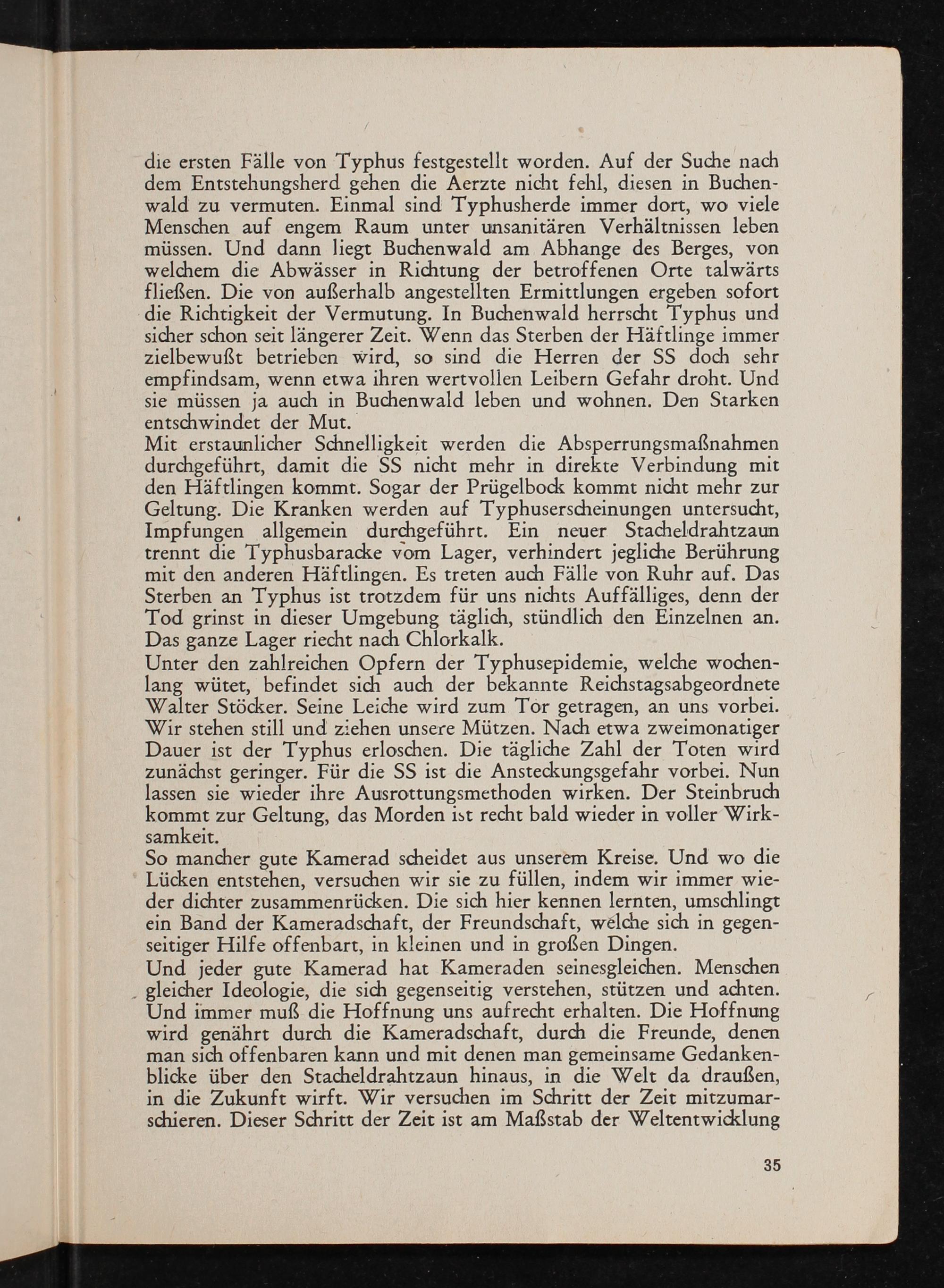 Unter den zahlreichen Opfern der Typhusepidemie, welche wochenlang wütet, befindet sich auch der bekannte Reichstagsabgeordnete Walter Stöcker . Seine Leiche wird zum Tor getragen, an uns vorbei. Wir stehen still und ziehen unsere Mützen. Nach etwa zweimonatiger Dauer ist der Typhus erloschen. Die tägliche Zahl der Toten wird zunächst geringer. Für die SS ist die Ansteckungsgefahr vorbei. Nun lassen sie wieder ihre Ausrottungsmethoden wirken. Der Steinbruch kommt zur Geltung, das Morden ist recht bald wieder in voller Wirksamkeit.