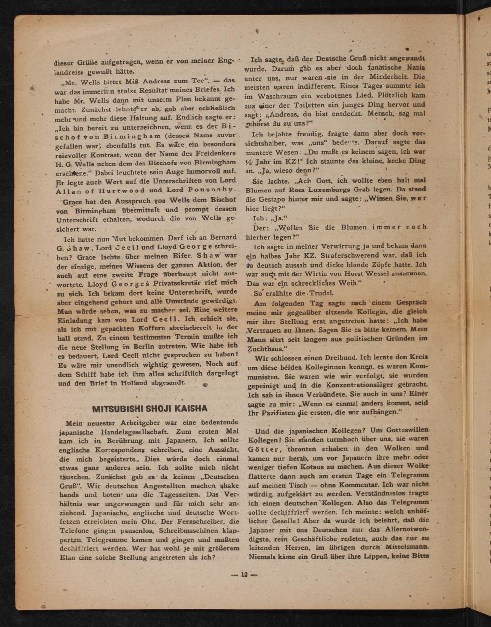 Mein neuester Arbeitgeber war eine bedeutende japanische Handelsgesellschaft. Zum ersten ersten Mal kam ich in Berührung mit Japanern. Ich sollte englische Korrespondenz schreiben, eine Aussicht, die mich begeisterte., Dies würde doch einmal etwas ganz anderes sein. Ich sollte mich nicht täuschen. Zunächst gab es da keinen„, Deutschen Gruß". Wir deutschen Angestellten machen shake hands und boten uns die Tageszeiten. Das Verhältnis war ungezwungen und für mich sehr anziehend. Japanische, englische und deutsche Wortfetzen erreichten mein Ohr. Der Fernschreiber, die Telefone gingen pausenlos, Schreibmaschinen klapperten, Telegramme kamen und gingen und mußten dechiffriert werden. Wer hat wohl je mit größerem Elan eine solche Stellung angetreten als ich?