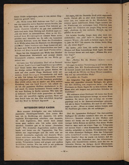 ,, Mr. Wells bittet Miẞ Andreas zum Tee", das war das immerhin stolze Resultat meines Briefes. Ich habe Mr. Wells dann mit unserm Plan bekannt gemacht. Zunächst lehnte er ab, gab aber schließlich mehr und mehr diese Haltung auf. Endlich sagte er: ,, Ich bin bereit zu unterzeichnen, wenn es der Bischof von Birmingham ( dessen Name zuvor. gefallen war; ebenfalls tut. Es wäre ein besonders reizvoller Kontrast, wenn der Name des Freidenkers H. G. Wells neben dem des Bischofs von Birmingham erschiene." Dabei leuchtete sein Auge humorvoll auf. Er legte auch Wert auf die Unterschriften von Lord Allan of Hurtwood und Lord Ponsonby.