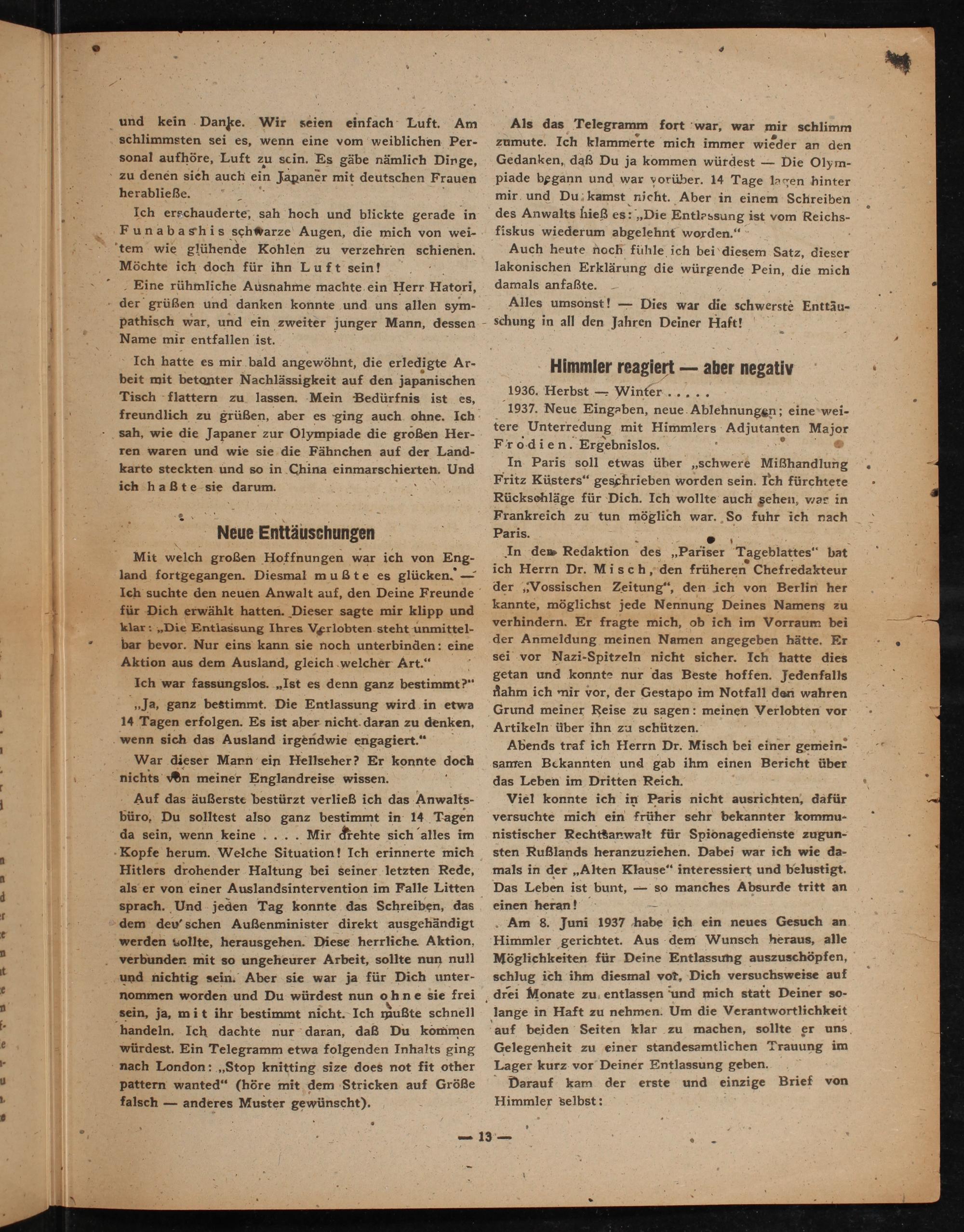 Als das Telegramm fort war, war mir schlimm zumute. Ich klammerte mich immer wieder an den Gedanken, daß Du ja kommen würdest Die Olympiade begann und war vorüber. 14 Tage lagen hinter mir und Du: kamst nicht. Aber in einem Schreiben des Anwalts hieß es: ,, Die Entlassung ist vom Reichsfiskus wiederum abgelehnt worden."