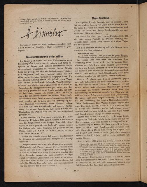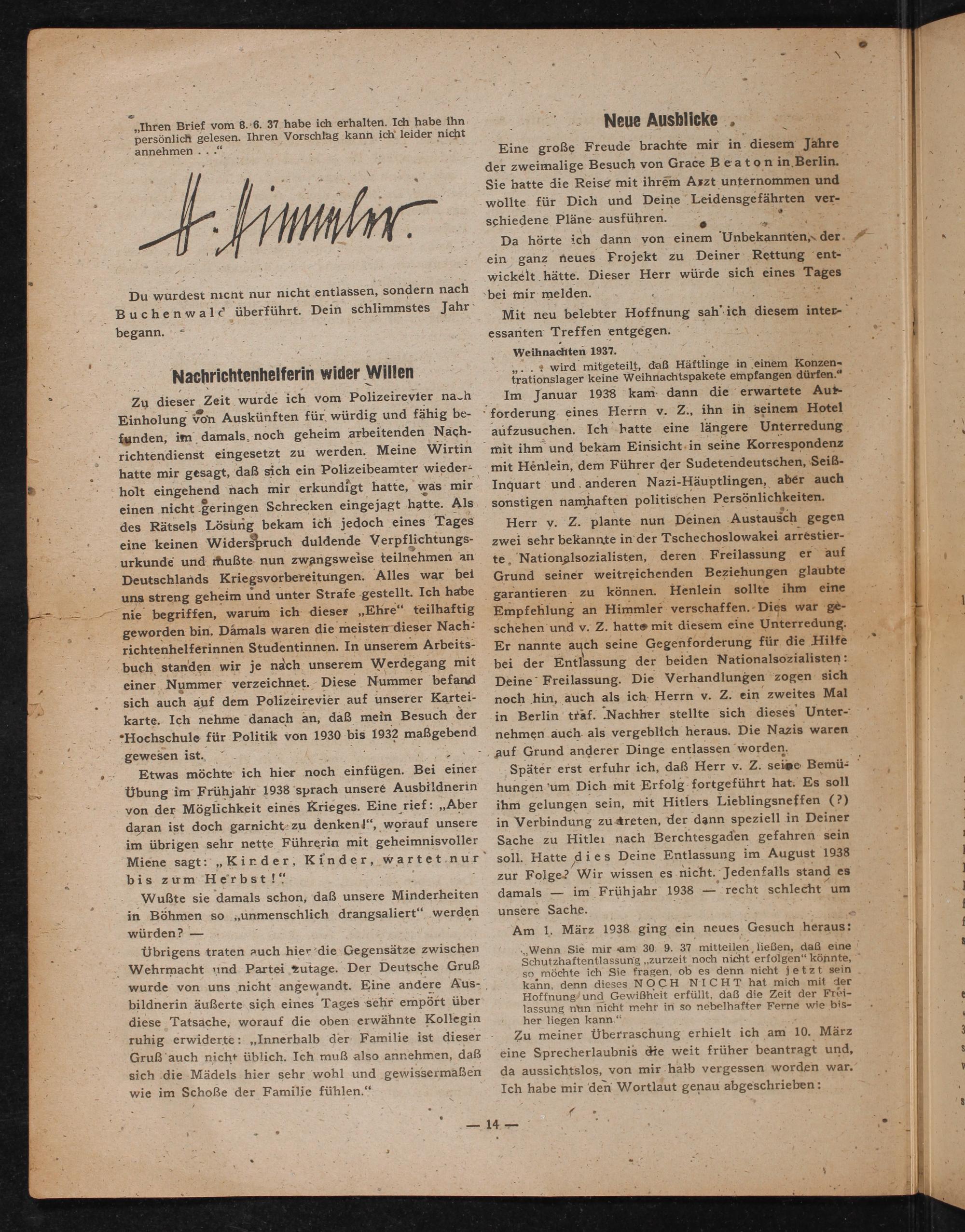 Herr y. Z. plante nun Deinen Austausch gegen zwei sehr bekannte in der Tschechoslowakei arrestierauf te, Nationalsozialisten, deren Freilassung er Grund seiner weitreichenden Beziehungen glaubte garantieren zu können. Henlein sollte ihm eine Empfehlung an Himmler verschaffen. Dies war geschehen und v. Z. hatte mit diesem eine Unterredung. Er nannte auch seine Gegenforderung für die Hilfe bei der Entlassung der beiden Nationalsozialisten: Deine Freilassung. Die Verhandlungen zogen sich noch hin, auch als ich Herrn v. Z. ein zweites Mal in Berlin traf. Nachher stellte sich dieses Unternehmen auch als vergeblich heraus. Die Nazis waren auf Grund anderer Dinge entlassen worden.