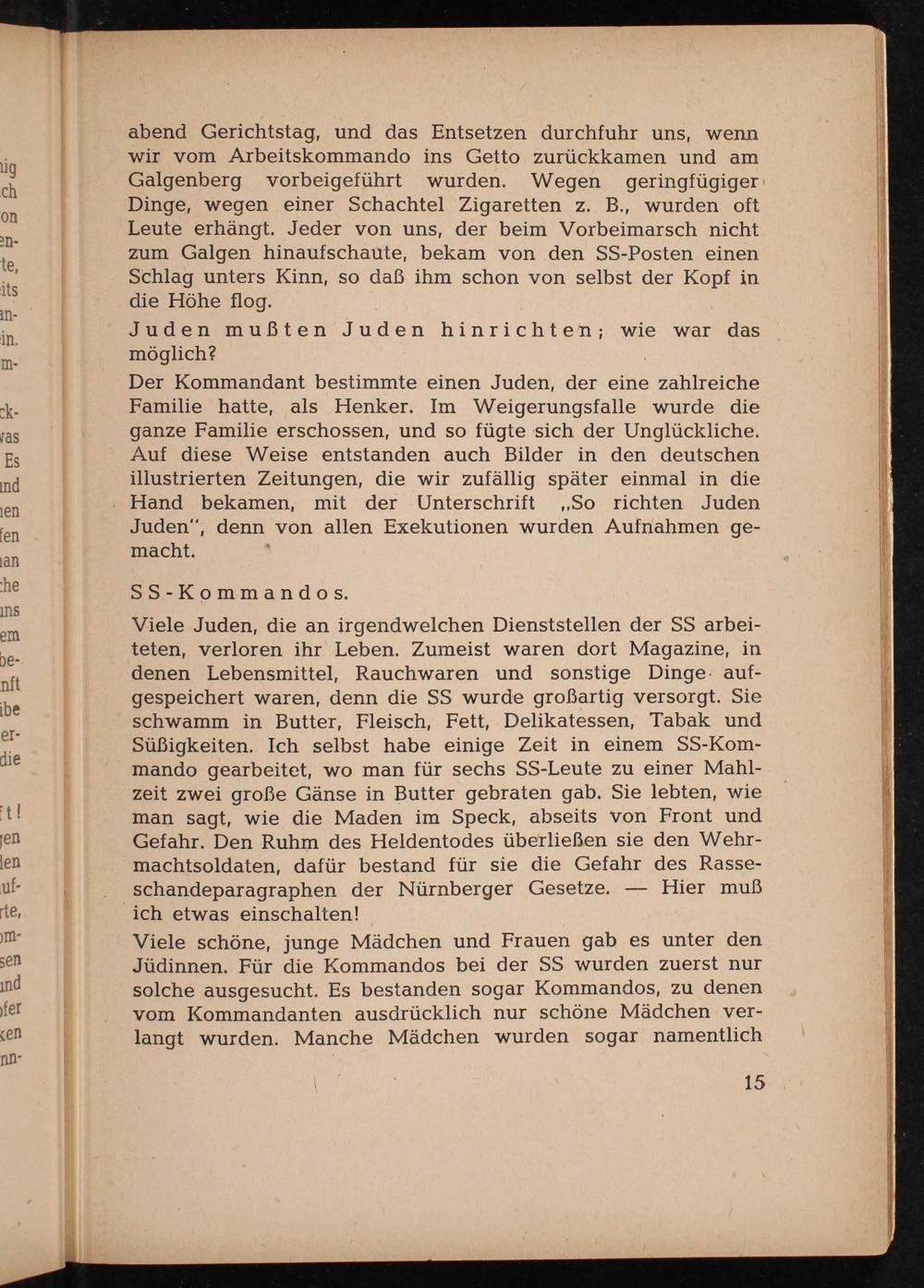 Viele schöne, junge Mädchen und Frauen gab es unter den Jüdinnen. Für die Kommandos bei der SS wurden zuerst nur solche ausgesucht. Es bestanden sogar Kommandos, zu denen vom Kommandanten ausdrücklich nur schöne Mädchen verlangt wurden. Manche Mädchen wurden sogar namentlich