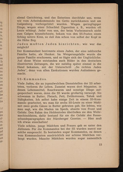 Der Kommandant bestimmte einen Juden, der eine zahlreiche Familie hatte, als Henker. Im Weigerungsfalle wurde die ganze Familie erschossen, und so fügte sich der Unglückliche. Auf diese Weise entstanden auch Bilder in den deutschen illustrierten Zeitungen, die wir zufällig später einmal in die Hand bekamen, mit der Unterschrift ,, So richten Juden Juden", denn von allen Exekutionen wurden Aufnahmen gemacht.