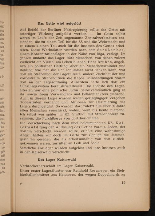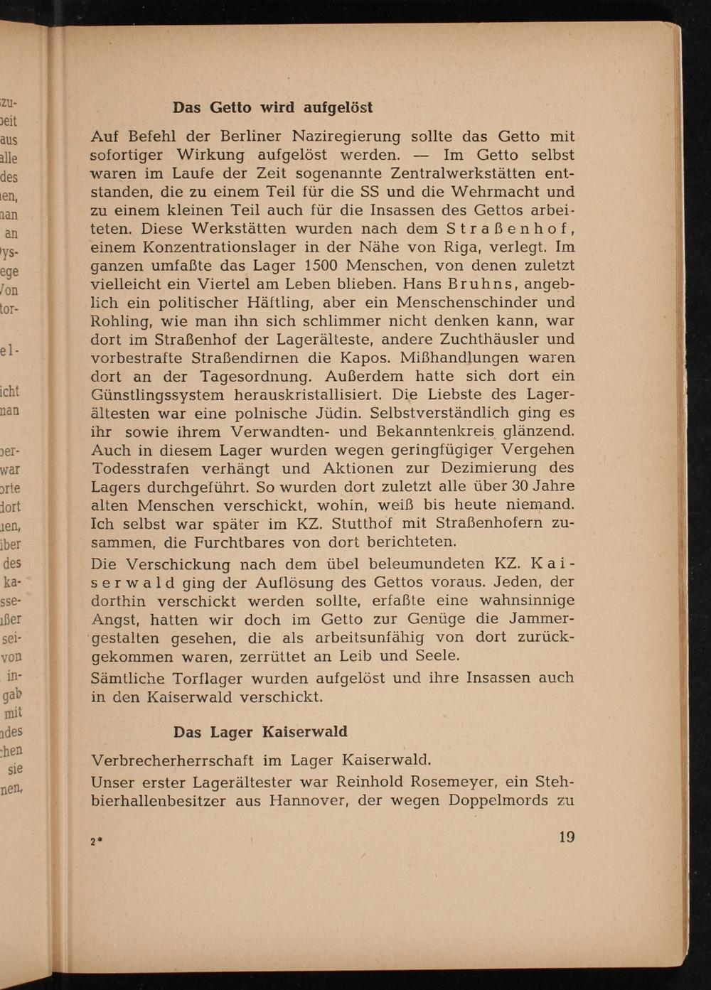 Auf Befehl der Berliner Naziregierung sollte das Getto mit sofortiger Wirkung aufgelöst werden. Im Getto selbst waren im Laufe der Zeit sogenannte Zentralwerkstätten entstanden, die zu einem Teil für die SS und die Wehrmacht und zu einem kleinen Teil auch für die Insassen des Gettos arbeiteten. Diese Werkstätten wurden nach dem Straßenhof, einem Konzentrationslager in der Nähe von Riga , verlegt. Im ganzen umfaßte das Lager 1500 Menschen, von denen zuletzt vielleicht ein Viertel am Leben blieben. Hans Bruhns, angeblich ein politischer Häftling, aber ein Menschenschinder und Rohling, wie man ihn sich schlimmer nicht denken kann, war dort im Straßenhof der Lagerälteste, andere Zuchthäusler und vorbestrafte Straßendirnen die Kapos. Mißhandlungen waren dort an der Tagesordnung. Außerdem hatte sich dort ein Günstlingssystem herauskristallisiert. Die Liebste des Lagerältesten war eine polnische Jüdin. Selbstverständlich ging es ihr sowie ihrem Verwandten- und Bekanntenkreis glänzend. Auch in diesem Lager wurden wegen geringfügiger Vergehen Todesstrafen verhängt und Aktionen zur Dezimierung des Lagers durchgeführt. So wurden dort zuletzt alle über 30 Jahre alten Menschen verschickt, wohin, weiß bis heute niemand. Ich selbst war später im KZ. Stutthof mit Straßenhofern zusammen, die Furchtbares von dort berichteten.