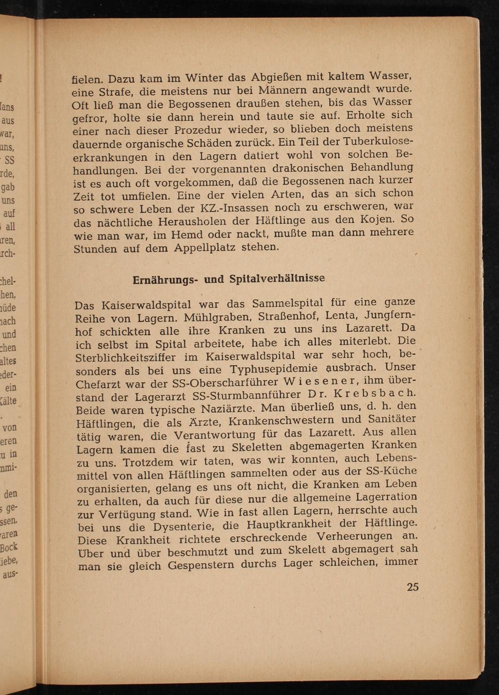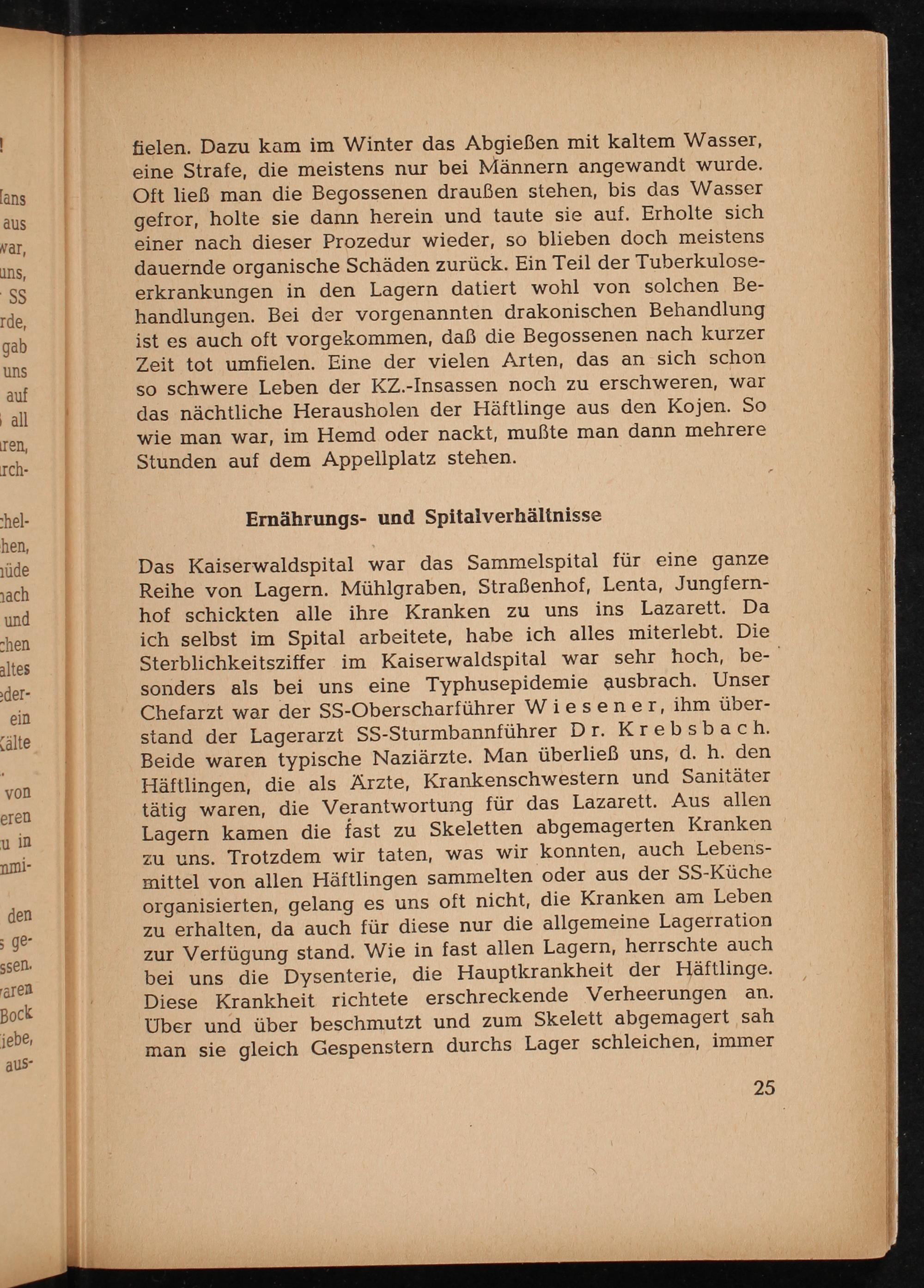 Das Kaiserwaldspital war das Sammelspital für eine ganze Reihe von Lagern. Mühlgraben, Straßenhof, Lenta, Jungfernhof schickten alle ihre Kranken zu uns ins Lazarett. Da ich selbst im Spital arbeitete, habe ich alles miterlebt. Die Sterblichkeitsziffer im Kaiserwaldspital war sehr hoch, besonders als bei uns eine Typhusepidemie ausbrach. Unser Chefarzt war der SS- Oberscharführer Wiesener, ihm überstand der Lagerarzt SS- Sturmbannführer Dr. Krebsbach . Beide waren typische Naziärzte. Man überließ uns, d. h. den Häftlingen, die als Ärzte, Krankenschwestern und Sanitäter tätig waren, die Verantwortung für das Lazarett. Aus allen Lagern kamen die fast zu Skeletten abgemagerten Kranken zu uns. Trotzdem wir taten, was wir konnten, auch Lebensmittel von allen Häftlingen sammelten oder aus der SS - Küche organisierten, gelang es uns oft nicht, die Kranken am Leben zu erhalten, da auch für diese nur die allgemeine Lagerration zur Verfügung stand. Wie in fast allen Lagern, herrschte auch bei uns die Dysenterie, die Hauptkrankheit der Häftlinge. Diese Krankheit richtete erschreckende Verheerungen an. Über und über beschmutzt und zum Skelett abgemagert sah man sie gleich Gespenstern durchs Lager schleichen, immer