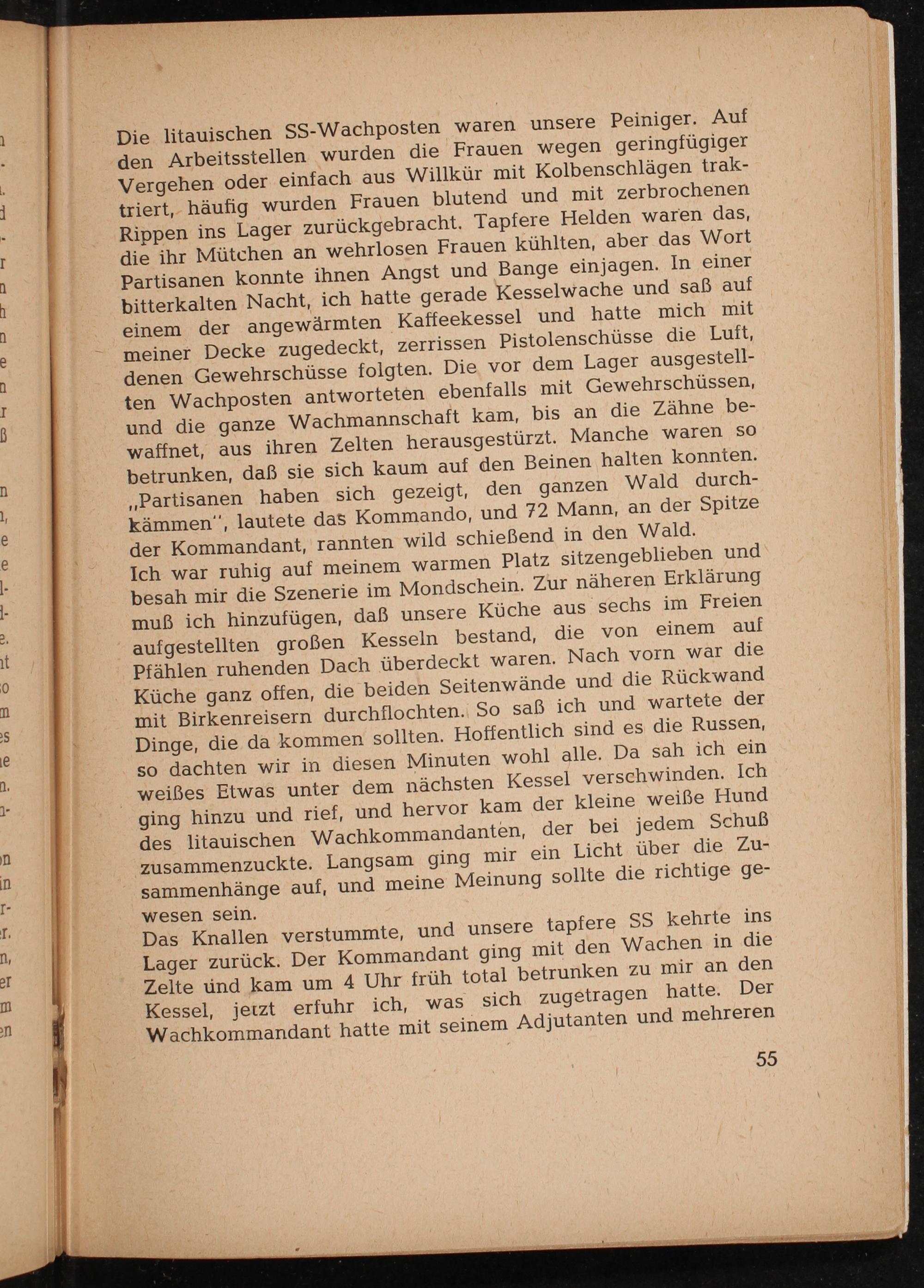 Die litauischen SS- Wachposten waren unsere Peiniger. Auf den Arbeitsstellen wurden die Frauen wegen geringfügiger Vergehen oder einfach aus Willkür mit Kolbenschlägen traktriert, häufig wurden Frauen blutend und mit zerbrochenen Rippen ins Lager zurückgebracht. Tapfere Helden waren das, die ihr Mütchen an wehrlosen Frauen kühlten, aber das Wort Partisanen konnte ihnen Angst und Bange einjagen. In einer bitterkalten Nacht, ich hatte gerade Kesselwache und saß auf einem der angewärmten Kaffeekessel und hatte mich mit meiner Decke zugedeckt, zerrissen Pistolenschüsse die Luft, denen Gewehrschüsse folgten. Die vor dem Lager ausgestellten Wachposten antworteten ebenfalls mit Gewehrschüssen, und die ganze Wachmannschaft kam, bis an die Zähne bewaffnet, aus ihren Zelten herausgestürzt. Manche waren so betrunken, daß sie sich kaum auf den Beinen halten konnten. ,, Partisanen haben sich gezeigt, den ganzen Wald durchkämmen", lautete das Kommando, und 72 Mann, an der Spitze der Kommandant, rannten wild schießend in den Wald. Ich war ruhig auf meinem warmen Platz sitzengeblieben und besah mir die Szenerie im Mondschein. Zur näheren Erklärung muß ich hinzufügen, daß unsere Küche aus sechs im Freien aufgestellten großen Kesseln bestand, die von einem auf Pfählen ruhenden Dach überdeckt waren. Nach vorn war die Küche ganz offen, die beiden Seitenwände und die Rückwand mit Birkenreisern durchflochten. So saß ich und wartete der Dinge, die da kommen sollten. Hoffentlich sind es die Russen, so dachten wir in diesen Minuten wohl alle. Da sah ich ein weißes Etwas unter dem nächsten Kessel verschwinden. Ich ging hinzu und rief, und hervor kam der kleine weiße Hund des litauischen Wachkommandanten, der bei jedem Schuß zusammenzuckte. Langsam ging mir ein Licht über die Zusammenhänge auf, und meine Meinung sollte die richtige gewesen sein.