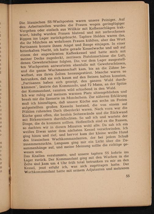 Das Knallen verstummte, und unsere tapfere SS kehrte ins Lager zurück. Der Kommandant ging mit den Wachen in die Zelte und kam um 4 Uhr früh total betrunken zu mir an den Kessel, jetzt erfuhr ich, was sich zugetragen hatte. Der Wachkommandant hatte mit seinem Adjutanten und mehreren