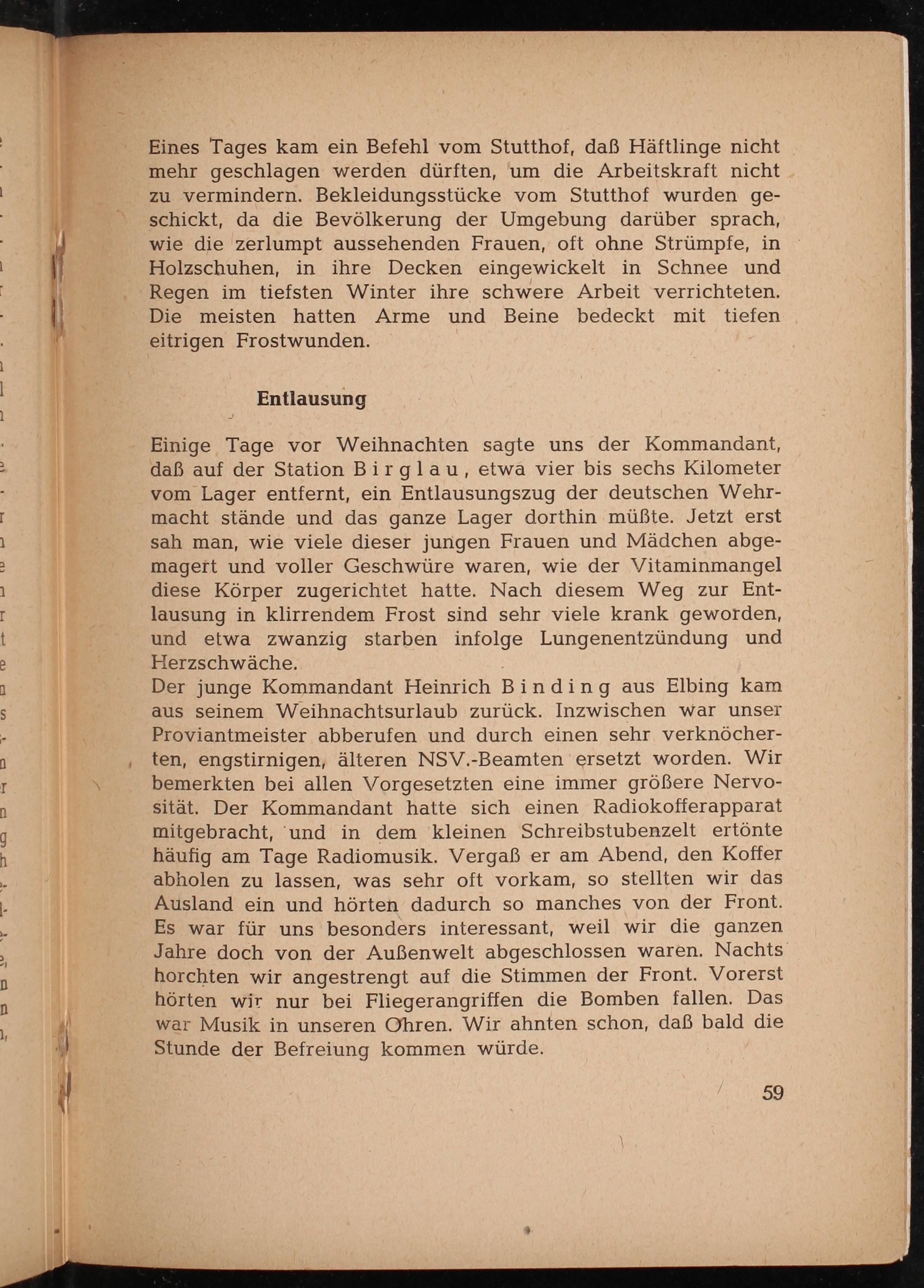Einige Tage vor Weihnachten sagte uns der Kommandant, daß auf der Station Birglau, etwa vier bis sechs Kilometer vom Lager entfernt, ein Entlausungszug der deutschen Wehrmacht stände und das ganze Lager dorthin müßte. Jetzt erst sah man, wie viele dieser jungen Frauen und Mädchen abgemagert und voller Geschwüre waren, wie der Vitaminmangel diese Körper zugerichtet hatte. Nach diesem Weg zur Entlausung in klirrendem Frost sind sehr viele krank geworden, und etwa zwanzig starben infolge Lungenentzündung und Herzschwäche.