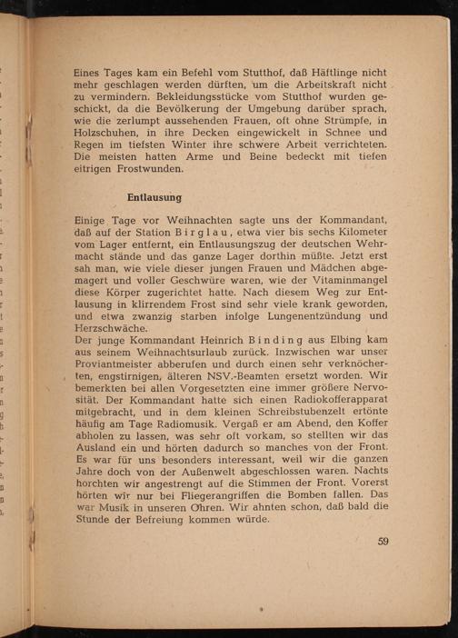 Eines Tages kam ein Befehl vom Stutthof , daß Häftlinge nicht mehr geschlagen werden dürften, um die Arbeitskraft nicht zu vermindern. Bekleidungsstücke vom Stutthof wurden geschickt, da die Bevölkerung der Umgebung darüber sprach, wie die zerlumpt aussehenden Frauen, oft ohne Strümpfe, in Holzschuhen, in ihre Decken eingewickelt in Schnee und Regen im tiefsten Winter ihre schwere Arbeit verrichteten. Die meisten hatten Arme und Beine bedeckt mit tiefen. eitrigen Frostwunden.