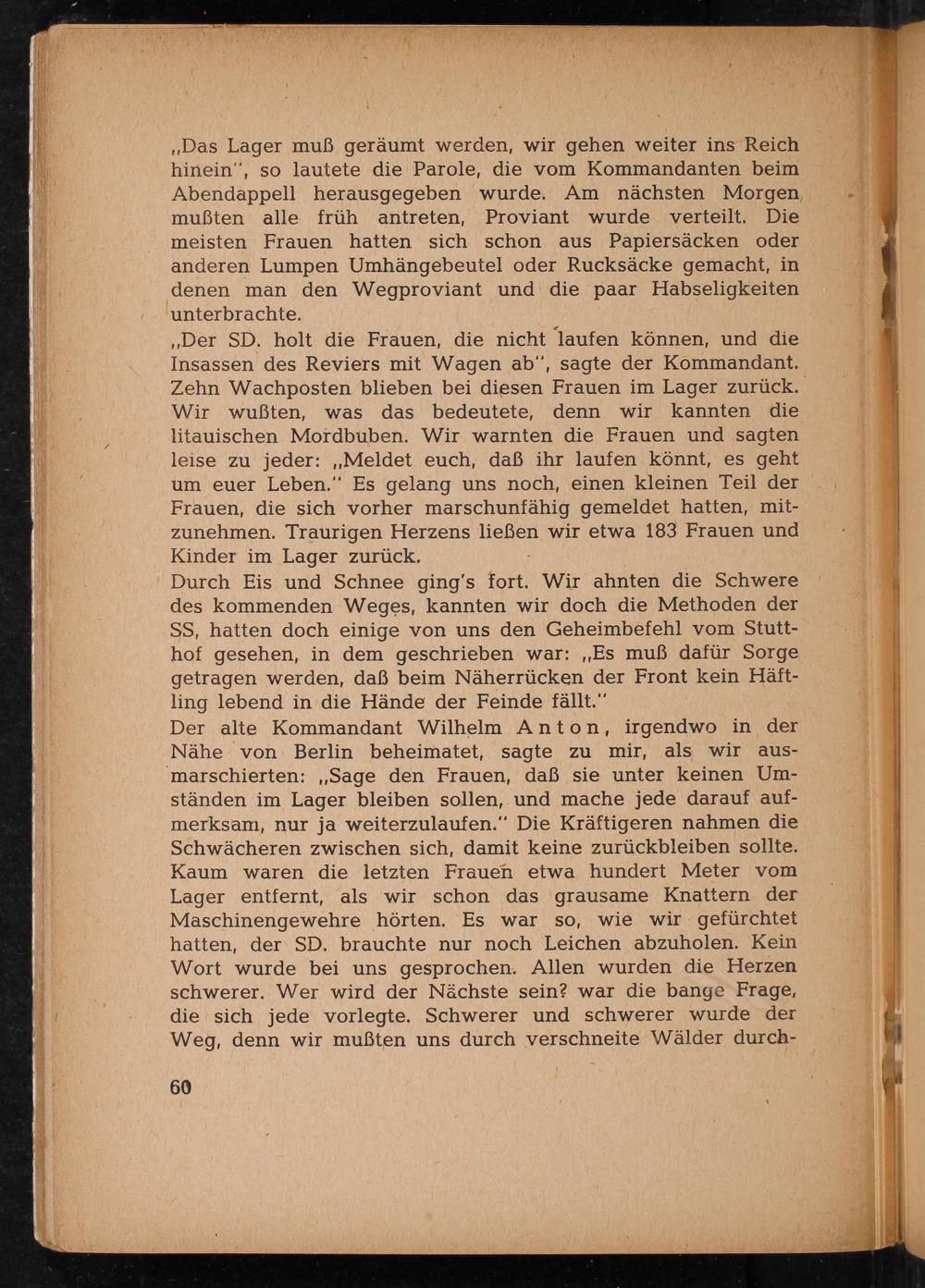 Der alte Kommandant Wilhelm Anton, irgendwo in der Nähe von Berlin beheimatet, sagte zu mir, als wir ausmarschierten: ,, Sage den Frauen, daß sie unter keinen Umständen im Lager bleiben sollen, und mache jede darauf aufmerksam, nur ja weiterzulaufen." Die Kräftigeren nahmen die Schwächeren zwischen sich, damit keine zurückbleiben sollte. Kaum waren die letzten Frauen etwa hundert Meter vom Lager entfernt, als wir schon das grausame Knattern der Maschinengewehre hörten. Es war so, wie wir gefürchtet hatten, der SD. brauchte nur noch Leichen abzuholen. Kein Wort wurde bei uns gesprochen. Allen wurden die Herzen schwerer. Wer wird der Nächste sein? war die bange Frage, die sich jede vorlegte. Schwerer und schwerer wurde der Weg, denn wir mußten uns durch verschneite Wälder durch