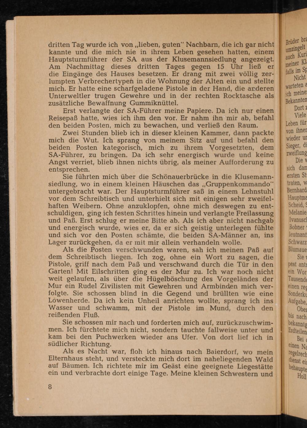 Sie führten mich über die Schönauerbrücke in die Klusemannsiedlung, wo in einem kleinen Häuschen das ,, Gruppenkommando" untergebracht war. Der Hauptsturmführer saß in einem Lehnstuhl vor dem Schreibtisch und unterhielt sich mit einigen sehr zweifelhaften Weibern. Ohne anzuklopfen, ohne mich deswegen zu entschuldigen, ging ich festen Schrittes hinein und verlangte Freilassung und Paẞ. Erst schlug er meine Bitte ab. Als ich aber nicht nachgab und energisch wurde, wies er, da er sich geistig unterlegen fühlte und sich vor den Posten schämte, die beiden SA- Männer an, ins Lager zurückgehen, da er mit mir allein verhandeln wolle.