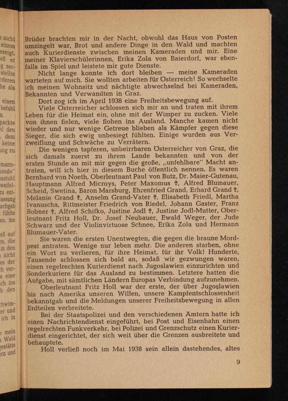 Brüder brachten mir in der Nacht, obwohl das Haus von Posten umzingelt war, Brot und andere Dinge in den Wald und machten auch Kurierdienste zwischen meinen Kameraden und mir. Eine meiner Klavierschülerinnen, Erika Zola von Baierdorf, war ebenfalls im Spiel und leistete mir gute Dienste.